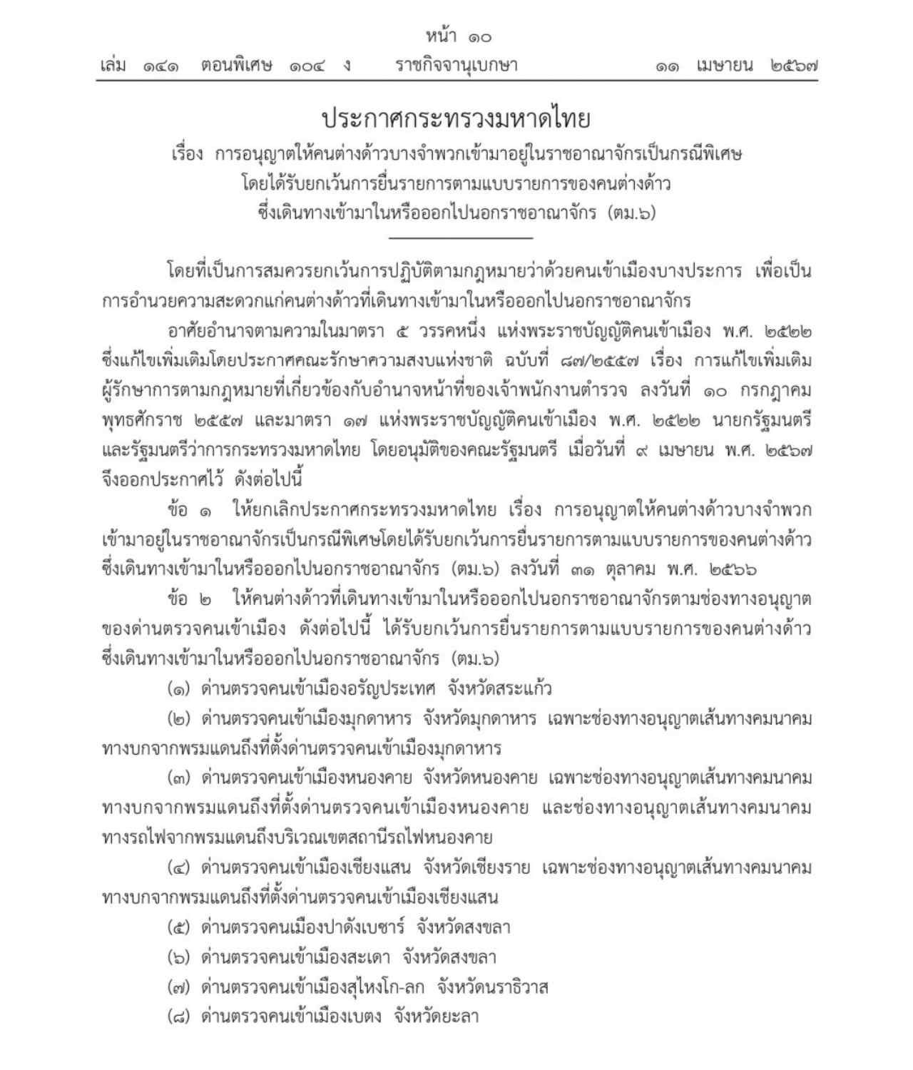 น.ส.ไตรศุลี กล่าวว่า ประกาศกระทรวงมหาดไทยฉบับนี้ จะอนุญาตให้คนต่างด้าวที่เดินทางเข้ามาในหรือออกไปนอกราชอาณาจักร ตามช่องทางอนุญาตของด่านตรวจคนเข้าเมืองทางบก ทั้งสิ้น 8 ด่าน ได้รับการยกเว้นการยื่นแบบ ตม.6 ประกอบด้วย (1) ด่านตรวจคนเข้าเมืองอรัญประเทศ จังหวัดสระแก้ว (2) ด่านตรวจคนเข้าเมืองมุกดาหาร จังหวัดมุกดาหาร เฉพาะช่องทางอนุญาตเส้นทางคมนาคมทางบกจากพรมแดนถึงที่ตั้งด่านตรวจคนเข้าเมืองมุกดาหาร (3) ด่านตรวจคนเข้าเมืองหนองคาย จังหวัดหนองคาย เฉพาะช่องทางอนุญาตเส้นทางคมนาคมทางบกจากพรมแดนถึงที่ตั้งด่านตรวจคนเข้าเมืองหนองคาย และช่องทางอนุญาตเส้นทางคมนาคมทางรถไฟ จากพรมแดนถึงบริเวณเขตสถานีรถไฟหนองคาย (4) ด่านตรวจคนเข้าเมืองเชียงแสน จังหวัดเชียงราย เฉพาะช่องทางอนุญาตเส้นทางคมนาคมทางบกจากพรมแดนถึงที่ตั้งด่านตรวจคนเข้าเมืองเชียงแสน (5) ด่านตรวจคนเมืองปาดังเบซาร์ จังหวัดสงขลา (6) ด่านตรวจคนเข้าเมืองสะเดา จังหวัดสงขลา (7) ด่านตรวจคนเข้าเมืองสุไหงโก-ลก จังหวัดนราธิวาส และ (8) ด่านตรวจคนเข้าเมืองเบตง จังหวัดยะลา บริเวณอ่าวหน้าทอน