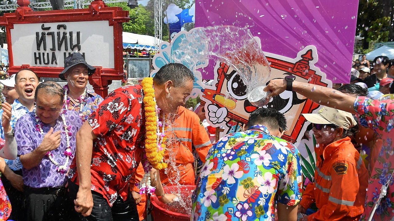 นายเศรษฐา ทวีสิน นายกฯ และ รมว.คลัง ในชุดเสื้อแดงลายดอก มีตัวอักษร พ เหมือนโลโก้ พรรคเพื่อไทย ร่วมเล่นน้ำสงกรานต์กับประชาชนอย่างเป็นกันเอง จนเปียกปอนทั้งตัว ระหว่างไปเป็นประธานเปิดงานเทศกาลสงกรานต์ประจำปี 2567 ที่จัดโดยเทศบาลนครเมืองหัวหิน ณ สวนสาธารณะโผนกิ่งเพชร อ.หัวหิน จ.ประจวบคีรีขันธ์.