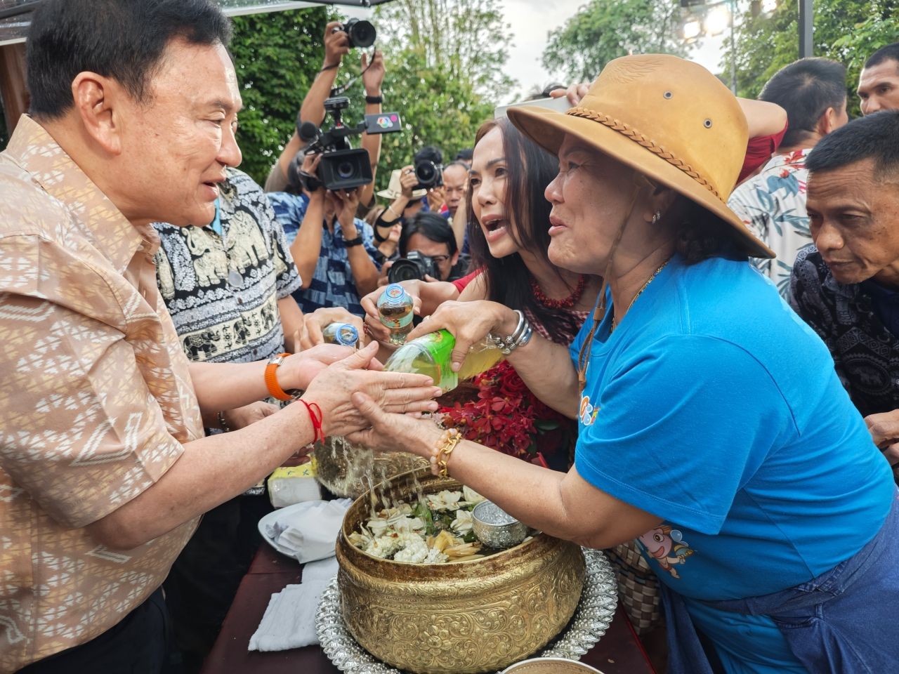 จากนั้น นายทักษิณ เดินมาที่สนามหญ้าก่อนเริ่มพิธีรดน้ำขอพร โดย นายทักษิณ อวยพรว่า วันนี้ถือว่าเป็นการรดน้ำดำหัวในยุคดิจิทัล ตนมีความสุขมากเพราะได้กลับมาบ้านเกิดและร่วมประเพณีรดน้ำดำหัวเป็นครั้งแรกในรอบ 18 ปี วันนี้หลายคนมาจับเนื้อจับตัวและถามว่าตัวเป็นๆ หรือเปล่า ซึ่งบางทีก็งงเหมือนกันว่าตัวเป็นๆ หรือเปล่า พร้อมกล่าวขอบคุณรัฐมนตรี สส. นายกองค์การบริหารส่วนจังหวัด และเพื่อนพี่น้องทุกคนที่วันนี้มารดน้ำดำหัว อาจถึงจะไม่ทั่วถึง แต่ก็ถือว่าได้รดน้ำดำหัว เห็นหน้าเห็นตากันแล้ว ก็ให้เป็นการรดน้ำดำหัวทางอากาศแล้วกัน