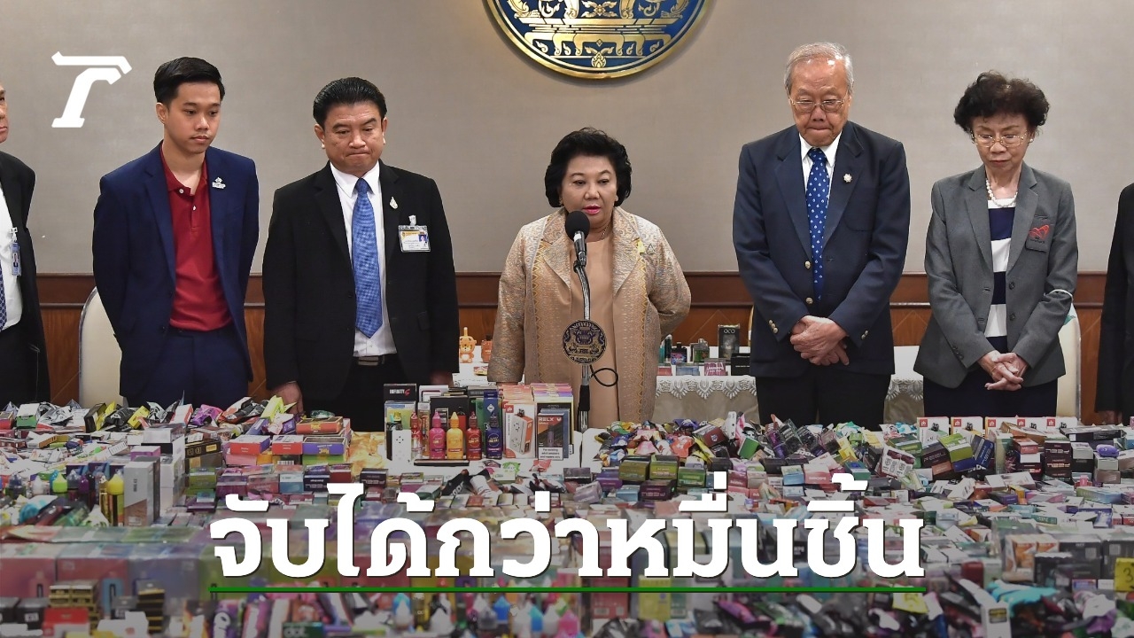 รัฐมนตรีประจำสำนักนายกรัฐมนตรี นำแถลงข่าว ผลปราบบุหรี่ไฟฟ้า พร้อมของกลางกว่า 10,000 ชิ้น มูลค่ารวมกว่า 3 ล้านบาท หลังจับได้ย่านรามคำแหง-ลาดพร้าว เตรียมขยายผลกวาดล้างทั่วประเทศ