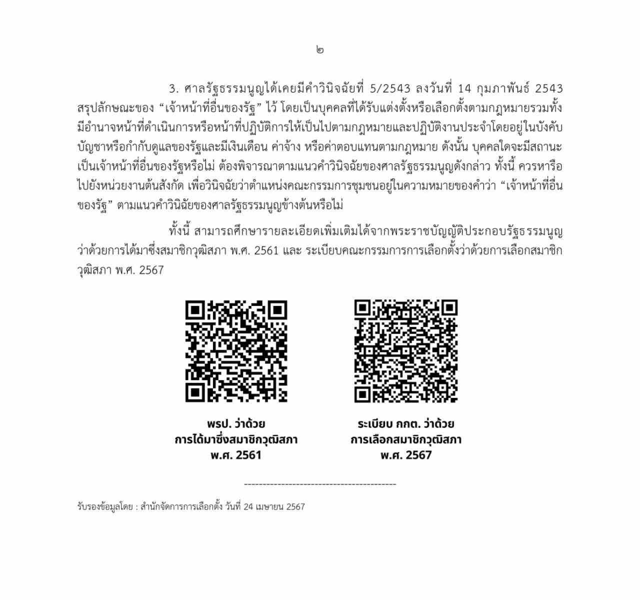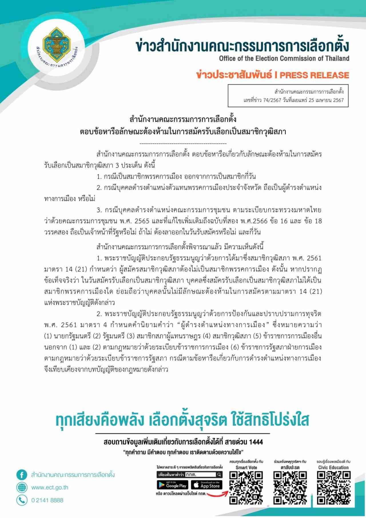 วันที่ 25 เมษายน 2567 ผู้สื่อข่าวรายงานว่า กกต.ออกคำชี้แจง ตอบข้อหารือ ลักษณะต้องห้ามในการสมัครรับเลือกเป็นสมาชิกวุฒิสภา 3 ประเด็น สมาชิกพรรคการเมือง ออกจากการเป็นสมาชิกกี่วัน ผู้ดำรงตำแหน่ง ตัวแทนพรรคการเมืองประจําจังหวัด ถือเป็นผู้ดํารงตําแหน่ง ทางการเมืองหรือไม่
