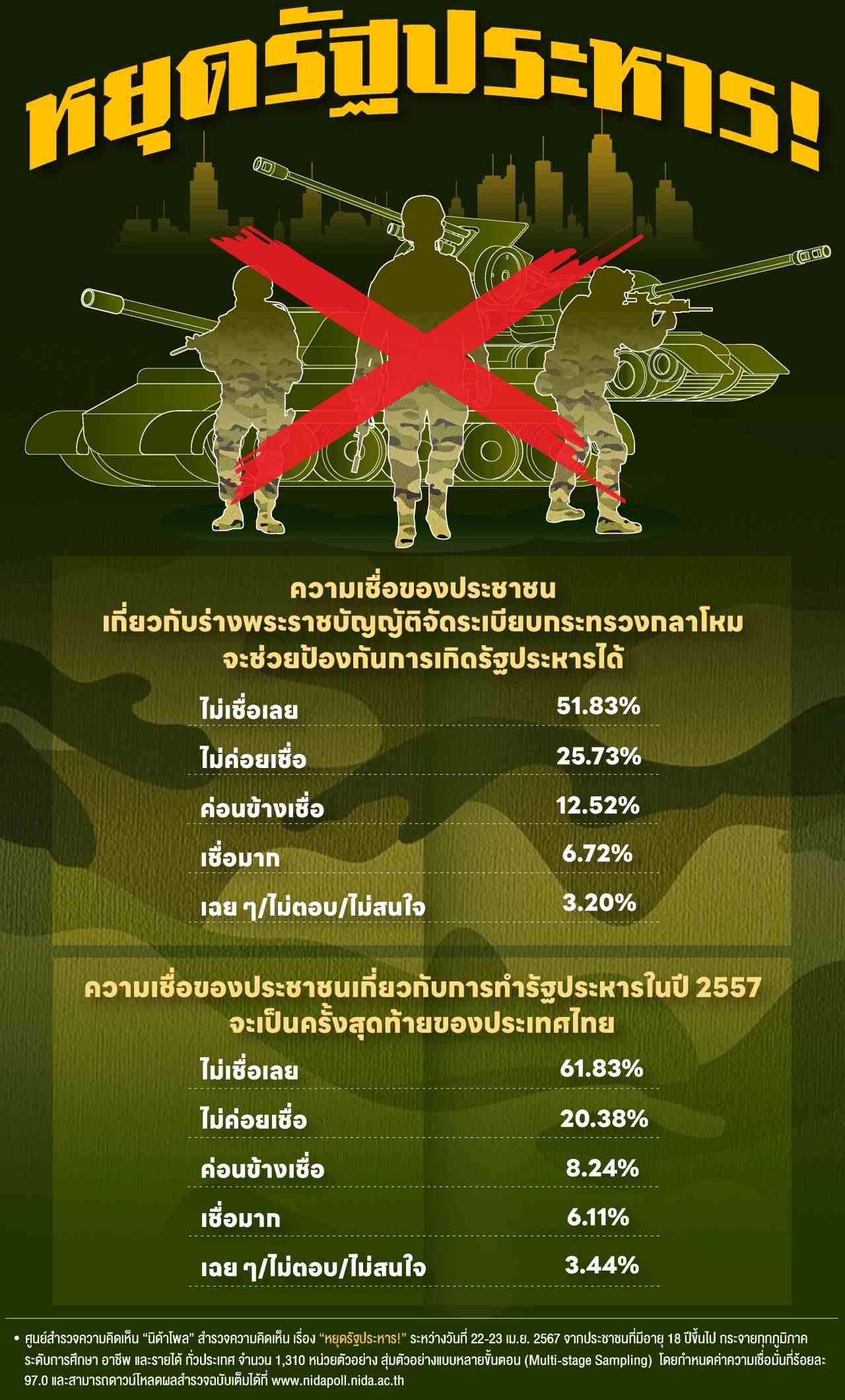 นิด้าโพล ชี้ คนกว่า 77% ไม่เชื่อ-ไม่ค่อยเชื่อ ร่าง พ.ร.บ.จัดระเบียบกลาโหม ช่วยป้องกันการ "รัฐประหาร" กว่า 82% ไม่เชื่อ-ไม่ค่อยเชื่อ รัฐประหารปี 2557 จะเป็นครั้งสุดท้าย