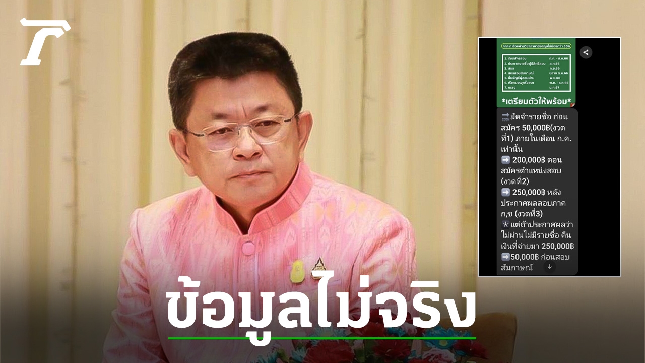 อธิบดี สถ. แจงปมเพจดังแฉเก็บค่าสมัครสอบเข้ารับราชการท้องถิ่น 5 แสน ยันไม่เป็นความจริง เหตุปี 2566 ไม่มีการจัดสอบ เตือนผู้สมัครสอบหากพบว่ามีการสมยอมเรียกรับเงิน จะต้องถูกปรับให้ตก และถูกตัดสิทธิ์ ไม่ให้สมัครสอบแข่งขันเป็นข้าราชการส่วนท้องถิ่นไปตลอดชีวิต