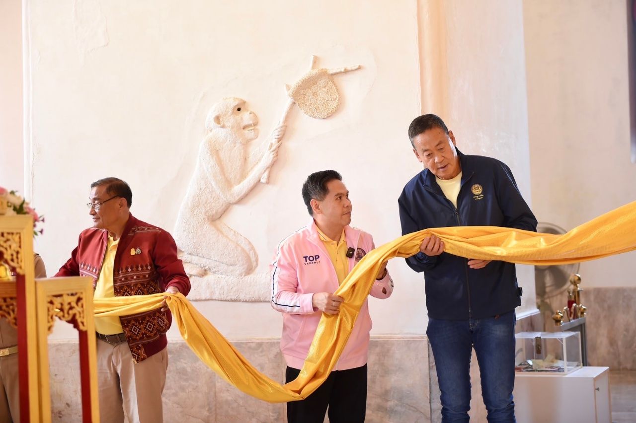 เจ้าคณะจังหวัด กล่าวว่า ตอนนั้นท่านบรรหารก็ทำให้กับ จ.สุพรรณบุรี มาก ก็เลยผูกพันลูกชาย เขาก็โอเค เขาก็สืบสานเจตนารมณ์ได้ดี ส่วนเรื่องเศรษฐกิจ สังคม การเมือง นายกฯ ก็สุดยอดอยู่แล้ว อาตมาไม่ต้องพูด แต่ขอฝากเรื่องการกระตุ้นเกี่ยวกับเรื่องคุณธรรม จริยธรรม ศีลธรรมในประเทศ ผ่านระบบการศึกษา หรือการปฏิบัติธรรมของข้าราชการ ถ้าคนมีธรรมะมาก ปัญหาทุกอย่างก็จะน้อยลง ก็ขอฝากไปยังกระทรวงวัฒนธรรมด้วย เอาธรรมะมาช่วยประเทศ นายกฯ จะได้บริหารประเทศได้สบายขึ้น คนมีธรรมะมาก ตัณหาจะน้อย แต่ถ้าคนมีธรรมะน้อย ตัณหาจะมาก โดยหลักก็จะง่ายๆ แค่นี้ โดยนายกฯ กล่าวว่า “รับไปปฏิบัติครับ” จากนั้นนายกฯ และคณะถ่ายรูปด้วยกัน