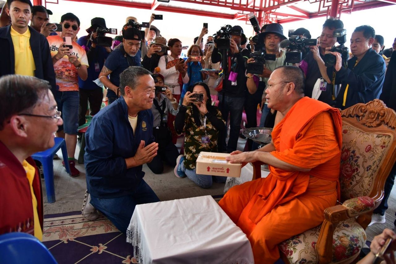 จากนั้นนายกฯ จุดธูปเทียนสักการะพระพุทธปุษยคีรีศรีสุวรรณภูมิ (หลวงพ่ออู่ทอง) พร้อมกราบนมัสการและสนทนาธรรมกับพระสุพรรณวชิราภรณ์ เจ้าคณะจังหวัดสุพรรณบุรี โดยเจ้าคณะจังหวัดกล่าวกับนายกฯ ว่า เป็นเรื่องที่ดีที่นายกฯ มาเหยียบสุพรรณ มาดูน้ำ ถ้ามันแล้งก็ช่วยดูด้วย และขอฝากรัฐมนตรีของอาตมา นายวราวุธ ศิลปอาชา รมว.การพัฒนาสังคมและความมั่นคงของมนุษย์ด้วย โดยนายกฯ กล่าวว่า ไม่ต้องฝาก เพราะท่านเก่ง ท่านดูแลตัวเองได้