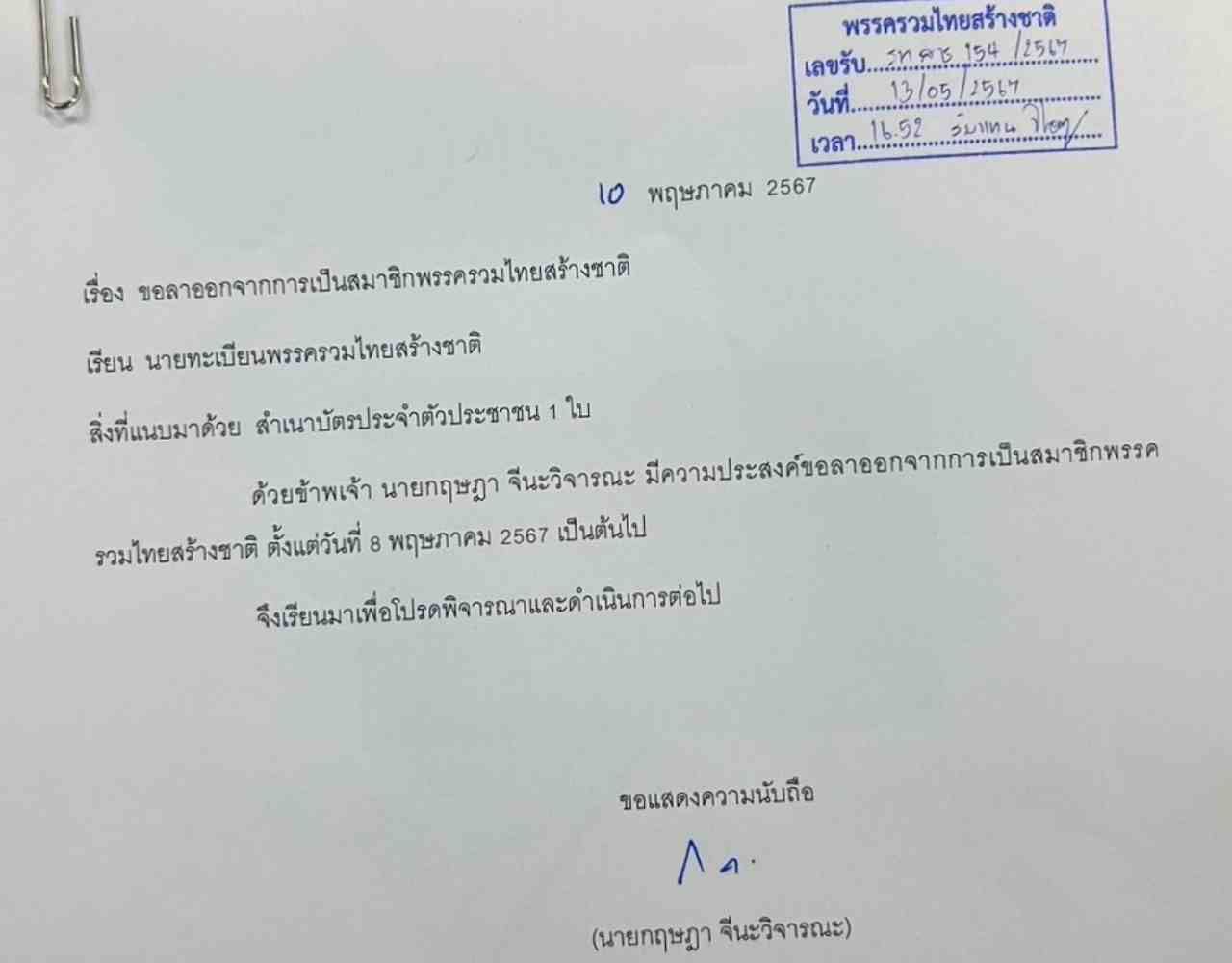 ผู้สื่อข่าวรายงานว่า นอกจากนี้ ยังมีการเผยแพร่หนังสือลาออกจากการเป็นสมาชิกพรรครวมไทยสร้างชาติของ นายกฤษฎา ลงวันที่ 10 พ.ค. โดย นายกฤษฎา ระบุในหนังสือลาออกว่า ด้วยข้าพเจ้า นายกฤษฎา จีนะวิจารณะ มีความประสงค์ขอลาออกจากการเป็นสมาชิกพรรครวมไทยสร้างชาติ ตั้งแต่วันที่ 8 พ.ค. เป็นต้นไป