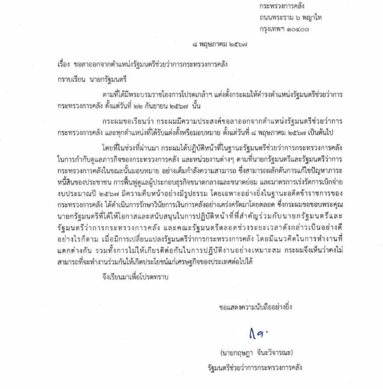 เปิดหนังสือลาออก “กฤษฎา จีนะวิจารณะ” จาก รมช.คลัง แจง เหตุแนวคิดการทำงานต่าง “พิชัย” พร้อมยื่นไขก๊อกสมาชิกพรรค รทสช.แล้ว