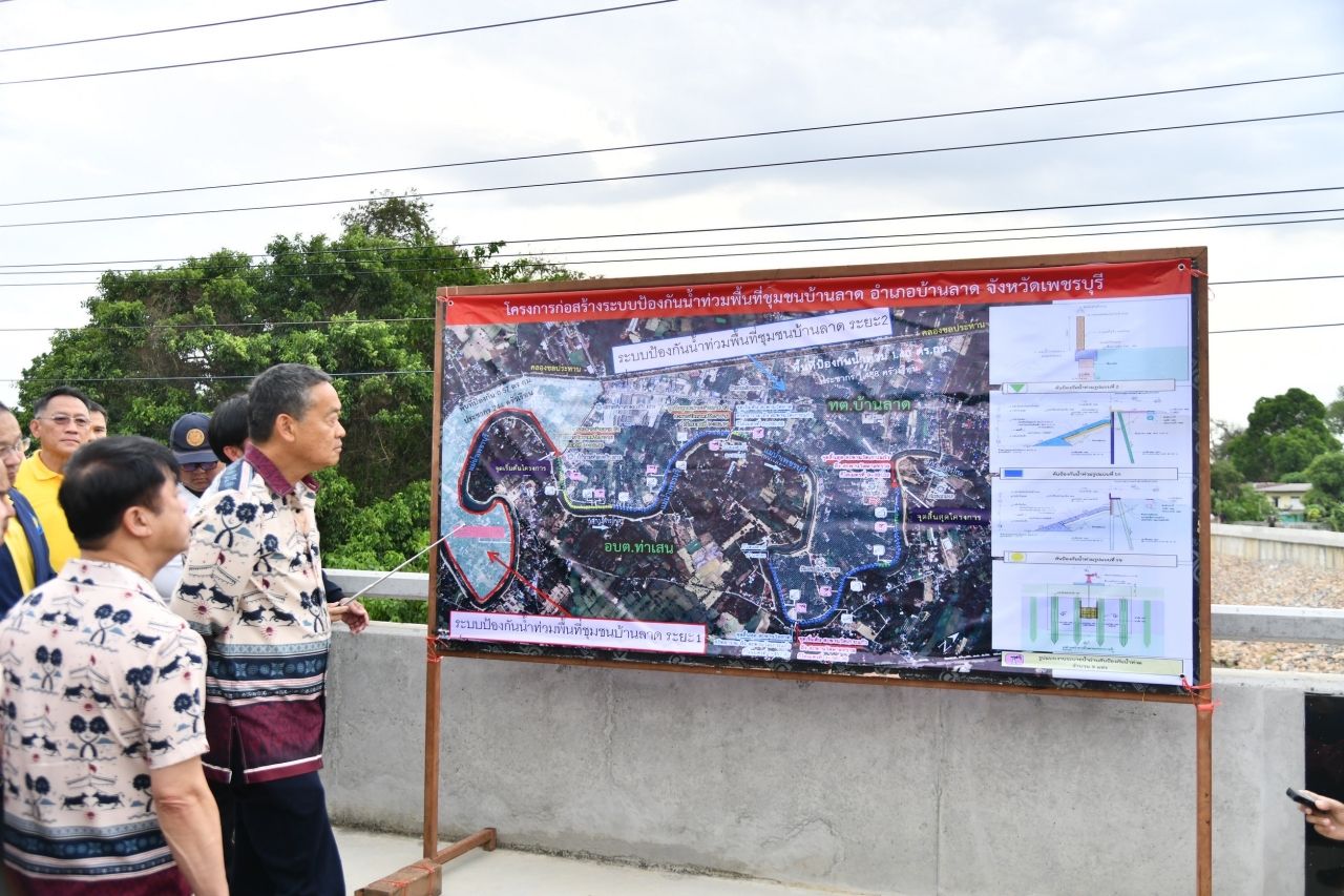 สำหรับโครงการก่อสร้างระบบป้องกันน้ำท่วมแม่น้ำเพชรบุรี แบ่งออกเป็น 2 ระยะ ได้แก่ ระยะที่ 1 โครงการก่อสร้างระบบป้องกันน้ำท่วมพื้นที่ชุมชนบ้านลาด ดำเนินการแล้ว 95% สามารถป้องกันน้ำท่วมในพื้นที่ 0.57 ตารางกิโลเมตร (ตร.กม.) และระยะที่ 2 จุดเริ่มต้นโครงการก่อสร้างสะพานบ้านลาด ถึงสะพานวัดลาดศรัทธาราม กิโลเมตรที่แม่น้ำเพชรบุรี จุดสิ้นสุดสะพานบ้านลาดถึงสะพานวัดลาดศรัทธาราม อยู่ในระหว่างดำเนินการ ซึ่งเมื่อดำเนินการสร้างแล้วเสร็จ จะสามารถป้องกันน้ำท่วมแก่ประชนในพื้นที่ได้ประมาณ 1,488 ครัวเรือน คาดว่าจะดำเนินการก่อสร้างเสร็จในปี 2569 จากนั้นนายกรัฐมนตรีทักทายประชาชนที่ถือป้ายมาต้อนรับ มีข้อความว่า “ชาวอำเภอบ้านลาด ขอขอบพระคุณท่านนายกรัฐมนตรี เศรษฐา ทวีสิน ที่ไม่ทิ้งประชาชน”