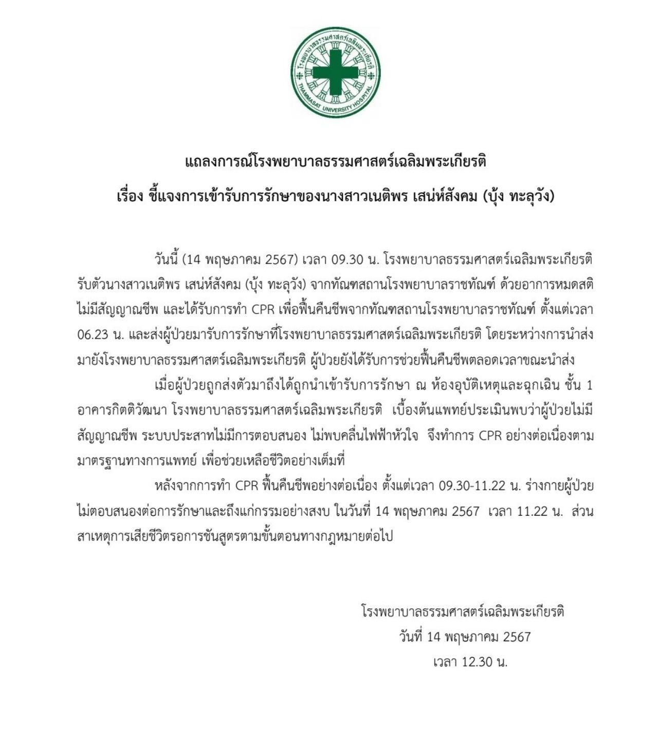วันที่ 14 พฤษภาคม 2567 ผู้สื่อข่าวรายงานว่า โรงพยาบาลธรรมศาสตร์เฉลิมพระเกียรติ เผยแพร่แถลงการณ์ลงเวลา 12.30 น. เรื่อง ชี้แจงการเข้ารับการรักษาของ นางสาวเนติพร เสน่ห์สังคม (บุ้ง ทะลุวัง) โดยเมื่อเวลา 09.30 น. โรงพยาบาลธรรมศาสตร์เฉลิมพระเกียรติ รับตัว นางสาวเนติพร จากทัณฑสถานโรงพยาบาลราชทัณฑ์ ด้วยอาการหมดสติ ไม่มีสัญญาณชีพ และได้รับการทำ CPR เพื่อฟื้นคืนชีพจากทัณฑสถานโรงพยาบาลราชทัณฑ์ ตั้งแต่เวลา 06.23 น. และส่งผู้ป่วยมารับการรักษาที่โรงพยาบาลธรรมศาสตร์เฉลิมพระเกียรติ โดยระหว่างการนำส่งมายังโรงพยาบาลธรรมศาสตร์เฉลิมพระเกียรติ ผู้ป่วยยังได้รับการช่วยฟื้นคืนชีพตลอดเวลาขณะนำส่ง