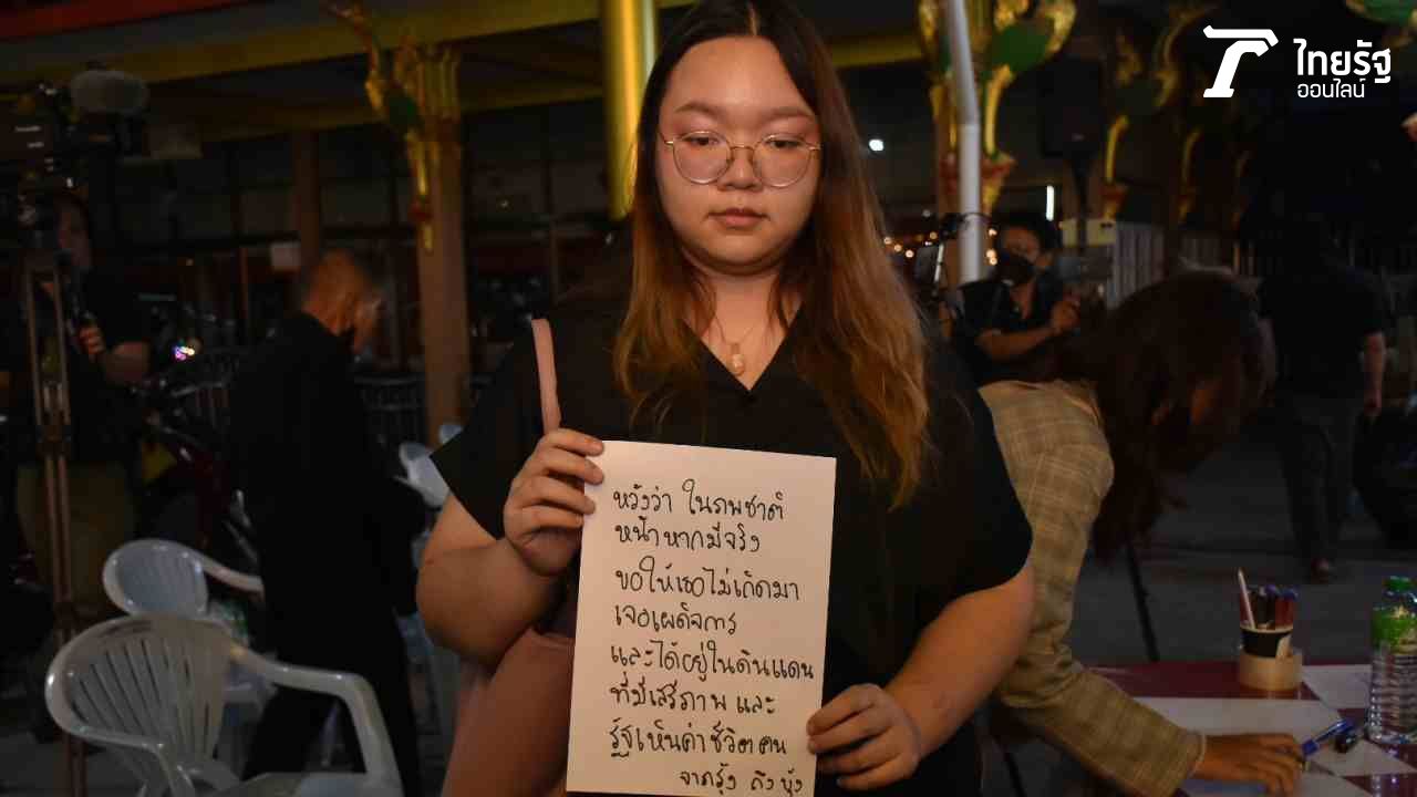 ต่อมาในเวลาประมาณ 18.50 น."รุ้ง" น.ส.ปนัสยา สิทธิจิรวัฒนกุล อดีตแกนนำแนวร่วมธรรมศาสตร์และการชุมนุม เดินทางมาร่วมฟังพระสวดอภิธรรม โดย "รุ้ง" ได้นั่งโต๊ะที่จัดไว้ให้สำหรับแขกที่มาร่วมได้เขียนข้อความแสดงความไว้อาลัย"บุ้ง" บนกระดาษ ซึ่งรุ้งได้เขียนว่า "