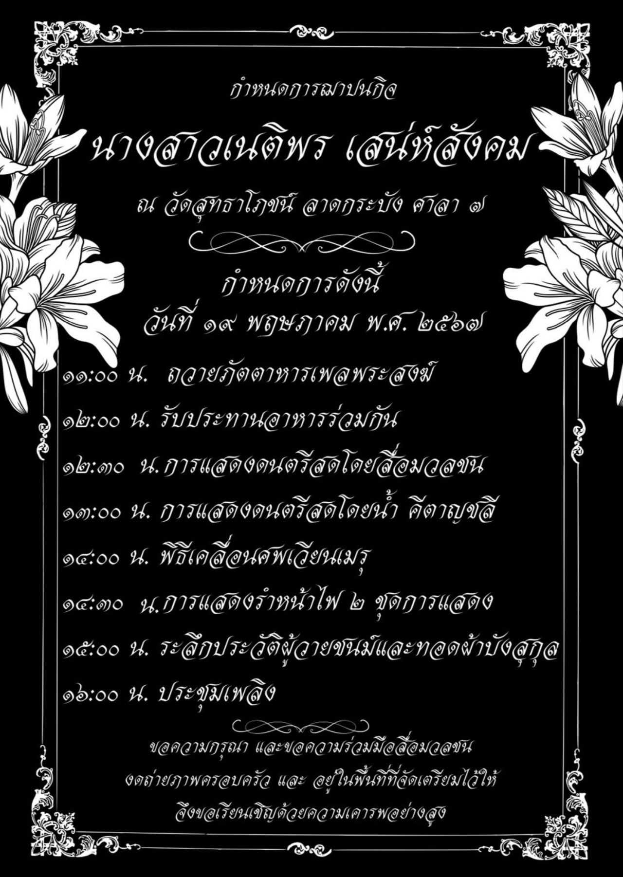 ขณะที่ น.ส.ณัฐนิช ดวงมุสิทธิ์ หรือ ใบปอ ทะลุวัง เผยกำหนดงานวันฌาปนกิจ ของบุ้ง ทะลุวัง ในวันที่ 19 พ.ค. ที่ศาลา 7 วัดสุทธาโภชน์ ลาดกระบัง ดังนี้ เวลา 11.00 น. ถวายภัตตาหารเพลพระสงฆ์ 12.00 น. รับประทานอาหารร่วมกัน
