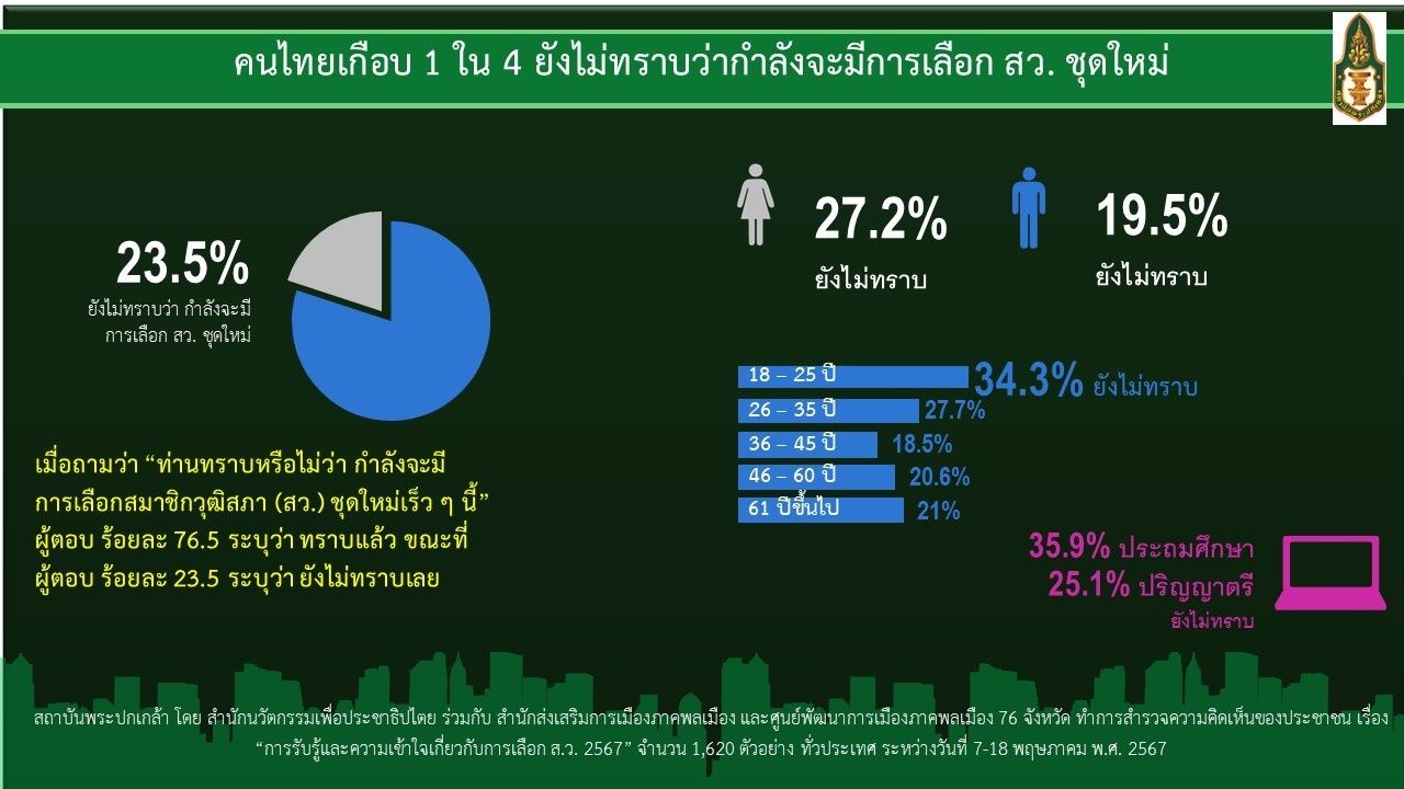 สถาบันพระปกเกล้า เผยผลสำรวจ พบคนไทยเกือบ 1 ใน 4 ยังไม่ทราบว่ากำลังจะมีการเลือก สว. ชุดใหม่ และอีก 70% ยังไม่ทราบวิธีการเลือก สว.
