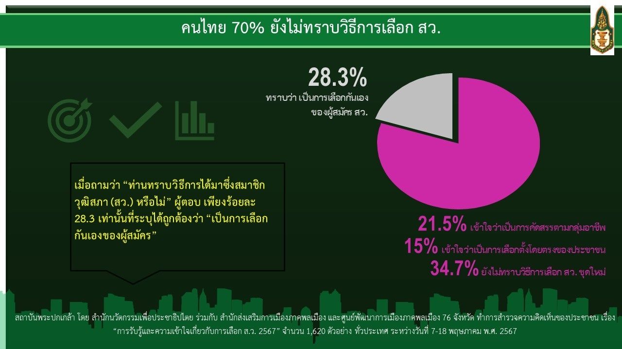 วันที่ 21 พฤษภาคม 2567 สถาบันพระปกเกล้า โดย สํานักนวัตกรรมเพื่อประชาธิปไตย ร่วมกับ สํานักส่งเสริมการเมืองภาคพลเมือง และศูนย์พัฒนาการเมืองภาคพลเมือง 76 จังหวัด ทําการสํารวจความคิดเห็นของประชาชน เรื่อง “การรับรู้และความเข้าใจเกี่ยวกับการเลือก ส.ว. 2567” จํานวน 1,620 ตัวอย่าง โดยทําการเก็บข้อมูลระหว่างวันที่ 7-18 พฤษภาคม พ.ศ.2567 ใช้วิธีการสัมภาษณ์ตามแบบสอบถามจากกลุ่มตัวอย่างซึ่งเป็นผู้มีสิทธิเลือกตั้ง (อายุ 18 ปี บริบูรณ์ขึ้นไป) ที่ได้จากการสุ่มตัวอย่างแบบแบ่งชั้นภูมิ (stratified random sampling) ในทุกจังหวัดรวมทั้ง กรุงเทพมหานคร
