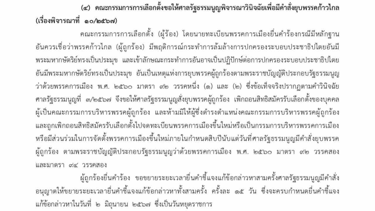 (4) คณะกรรมการการเลือกตั้งขอให้ศาลรัฐธรรมนูญพิจารณาวินิจฉัยเพื่อมีคําสั่งยุบพรรคก้าวไกล (เรื่องพิจารณาที่ 10/2567)