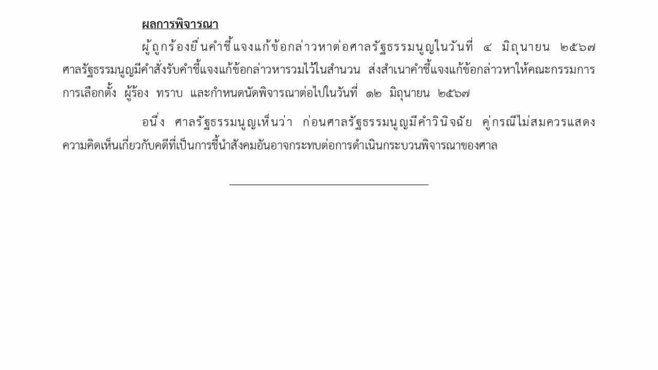 ผู้ถูกร้องยื่นคําชี้แจงแก้ข้อกล่าวหาต่อศาลรัฐธรรมนูญในวันที่ 4 มิถุนายน 2567 ศาลรัฐธรรมนูญมีคําสั่งรับคําชี้แจงแก้ข้อกล่าวหารวมไว้ในสํานวน ส่งสําเนาคําชี้แจง แก้ข้อกล่าวหาให้คณะกรรมการการเลือกตั้ง ผู้ร้อง ทราบ และกําหนดนัดพิจารณาต่อไปในวันที่ 12 มิถุนายน 2567