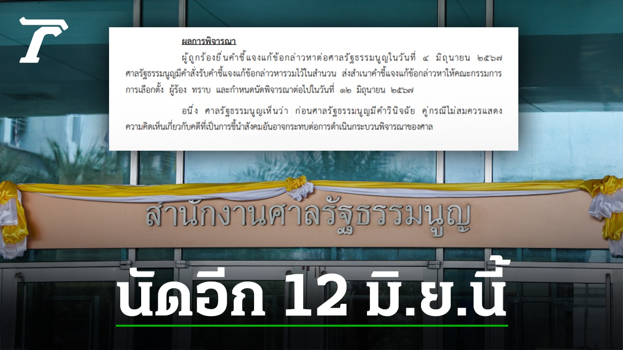 วันที่ 5 มิ.ย. 67 ศาลรัฐธรรมนูญ ออกเอกสาร นัด 12 มิ.ย. 2567 พิจารณาคดียุบพรรคก้าวไกลต่อ พร้อมกำชับให้พรรคก้าวไกล ระหว่างนี้ไม่ควรแสดงความคิดเห็นใดๆ ชี้นำสังคม กระทบการพิจารณาคดีของศาล รธน.