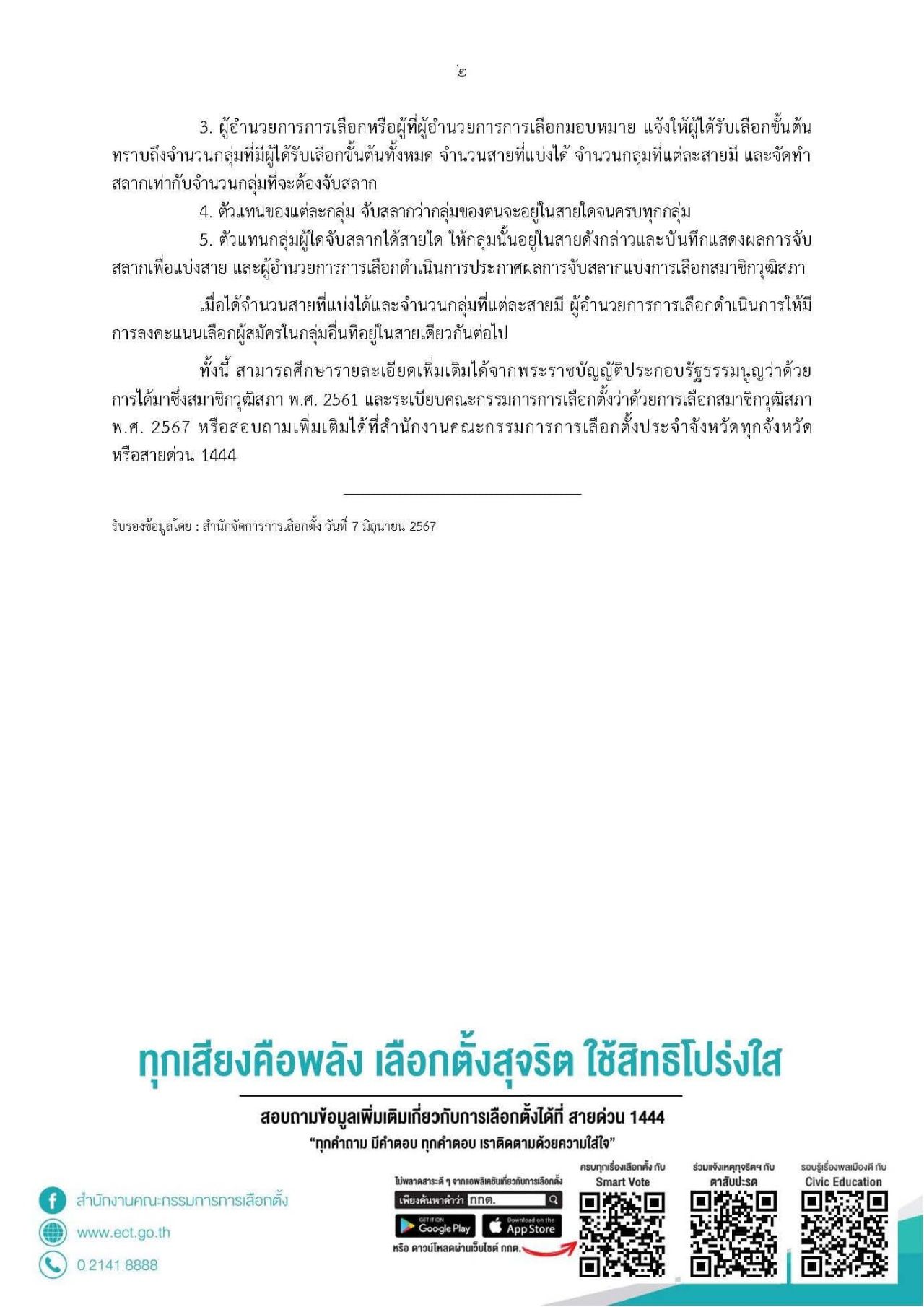 3. ผู้อำนวยการการเลือกหรือผู้ที่ผู้อำนวยการการเลือกมอบหมาย แจ้งให้ผู้ได้รับเลือกขั้นต้น ทราบถึงจำนวนกลุ่มที่มีผู้ได้รับเลือกขั้นต้นทั้งหมด จำนวนสายที่แบ่งได้ จำนวนกลุ่มที่แต่ละสายมี และจัดทำสลากเท่ากับจำนวนกลุ่มที่จะต้องจับสลาก