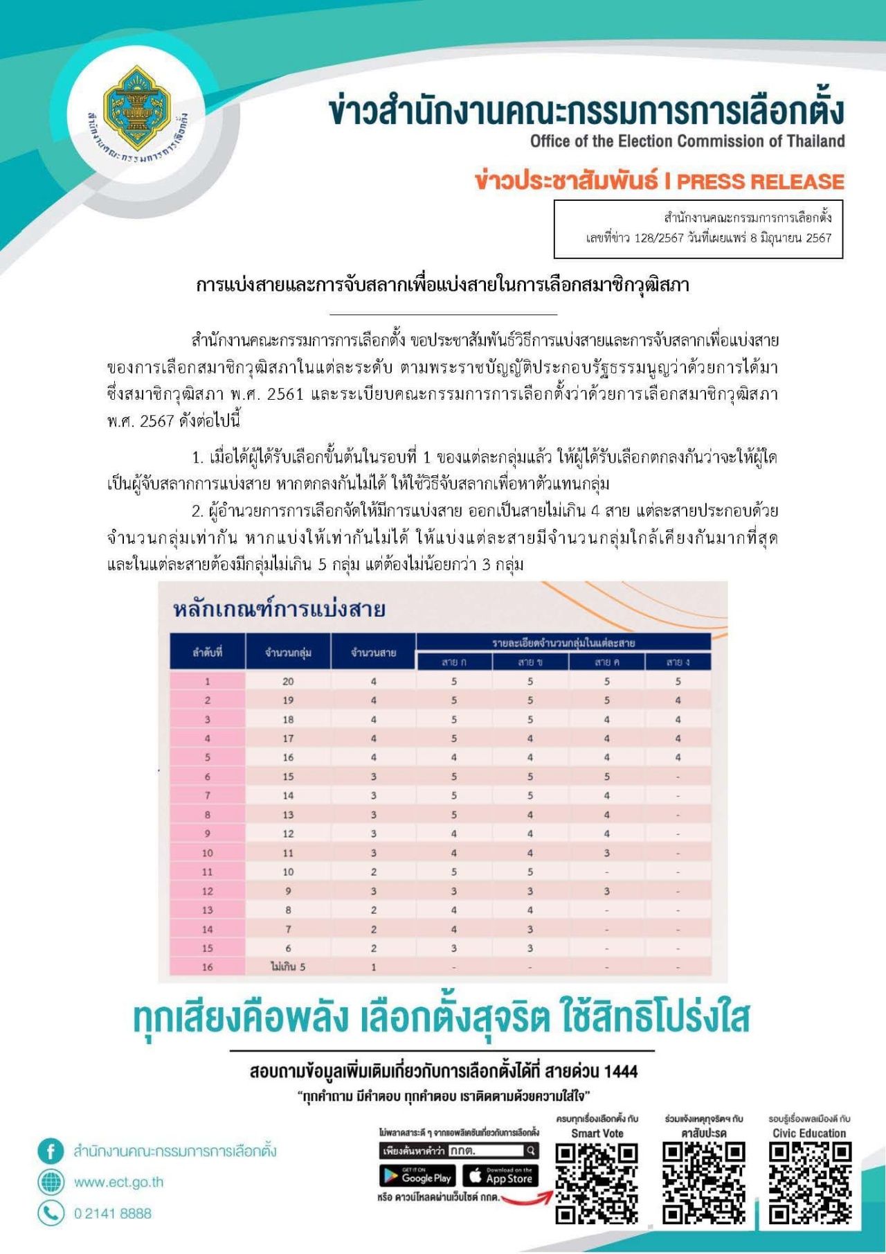 สำนักงานคณะกรรมการการเลือกตั้ง ชี้แจงการแบ่งสายและจับสลากเลือก สว. ทุกระดับ ให้แต่ละกลุ่มจับสลากหาตัวแทนกลุ่ม แบ่งสายได้ไม่เกิน 5 กลุ่ม แต่ไม่น้อยกว่า 3 กลุ่ม ให้ตัวแทนกลุ่มจับสลากว่าได้สายใด ก่อนประกาศผลการเลือก สว.
