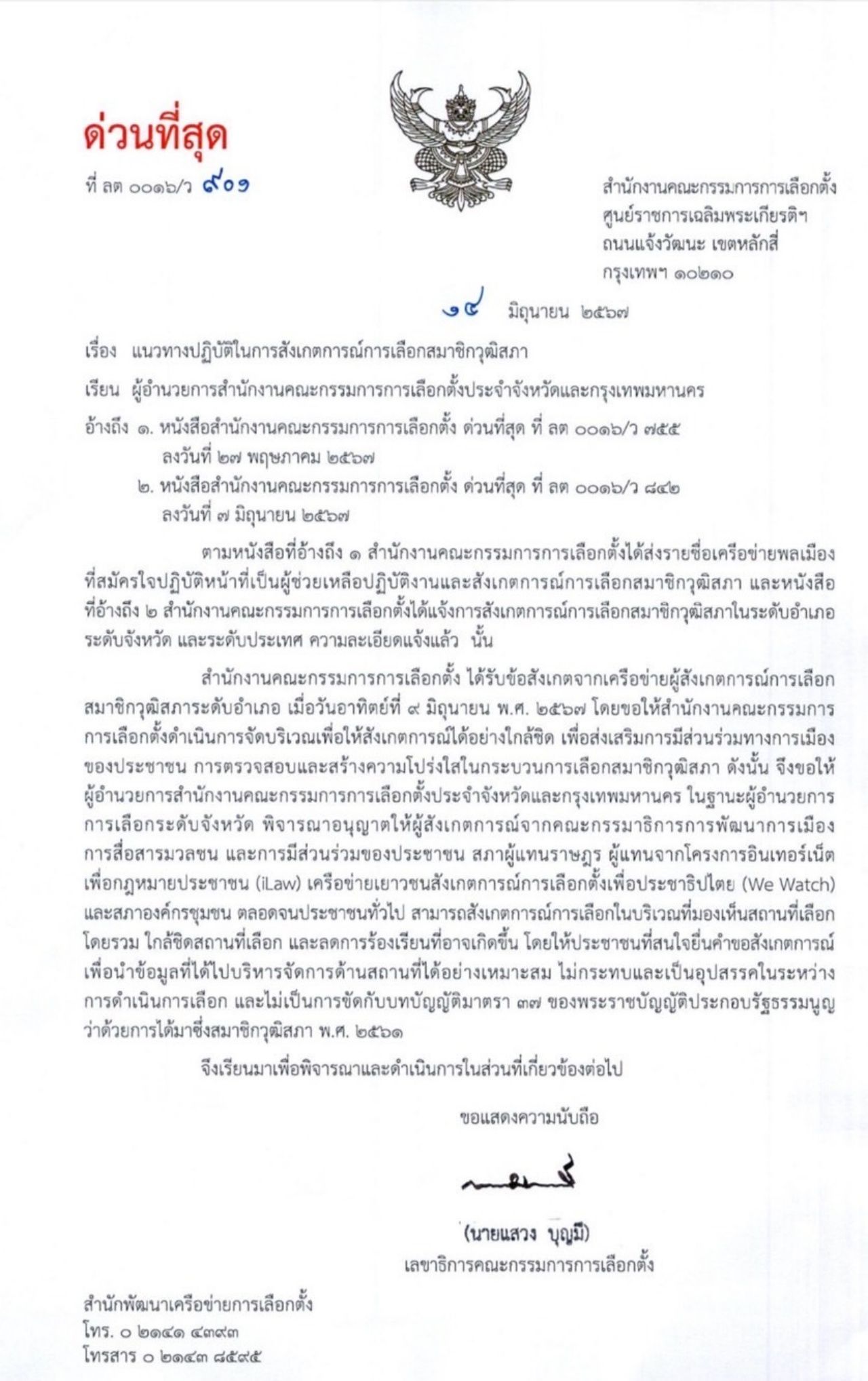 “แสวง บุญมี” ส่งหนังสือด่วน ถึง ผู้อำนวยการสำนักงานคณะกรรมการการเลือกตั้งประจำจังหวัดและกรุงเทพมหานคร ให้ กมธ.พัฒนาการเมือง-iLaw-We Watch-สภาองค์กรชุมชน-ประชาชน ร่วมสังเกตการณ์เลือก สว. ทุกระดับได้