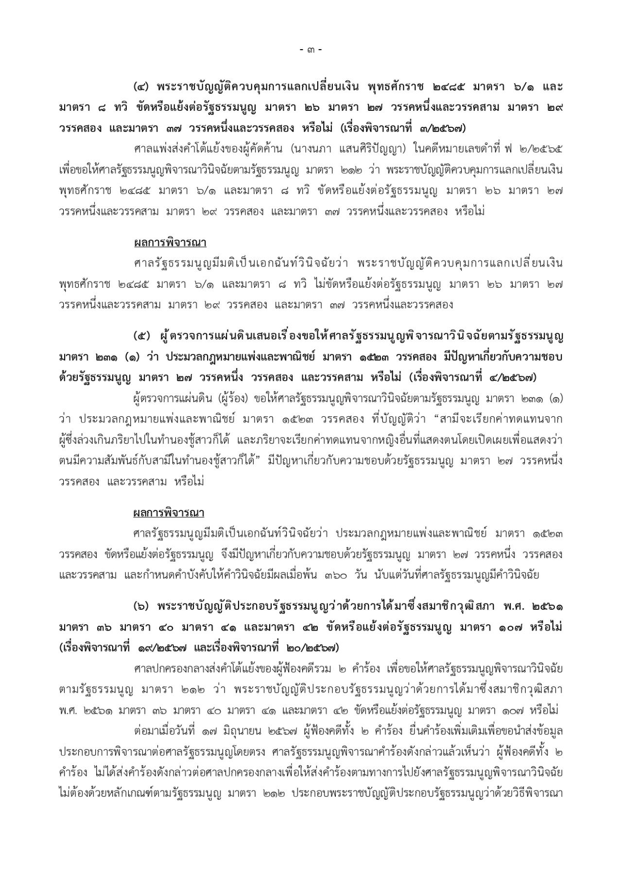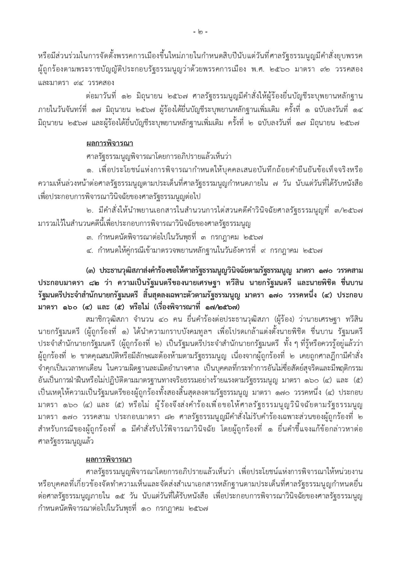 2. มีคำสั่งให้นำพยานเอกสารในสำนวนการไต่สวนคดีคำวินิจฉัยศาลรัฐธรรมนูญที่ 3/2567 มารวมไว้ในสำนวนคดีนี้เพื่อประกอบการพิจารณาวินิจฉัยของศาลรัฐธรรมนูญ