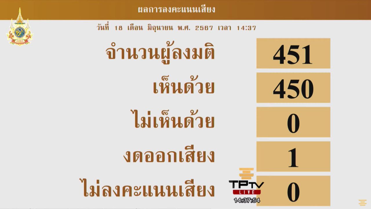 ที่ประชุมสภา ลงมติ 450 เสียง รับหลักการร่าง พ.ร.บ.ประชามติทั้ง 4 ฉบับ ตั้งกรรมาธิการ ก่อนสั่งปิดประชุม พรุ่งนี้เริ่มอภิปรายงบประมาณ 2568 ไปจนถึง 21 มิ.ย. 2567