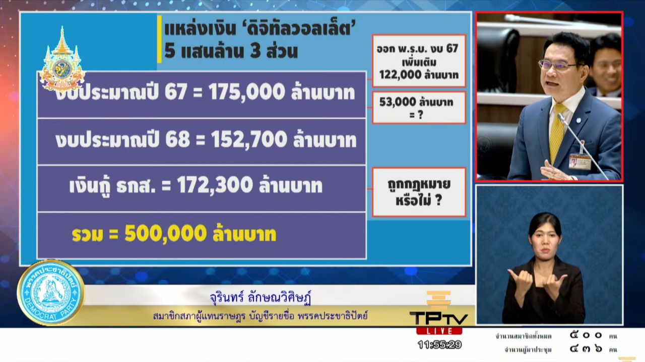 “งบ 68 มันเหมือนงบเป็ดขี้เหร่ เพราะทั้งหลอกสภา ทั้งทำสัดส่วนรายได้สุทธิน้อยกว่าเดิม ทั้งทำงบขาดดุลมากสุดในประวัติศาสตร์ ทั้งจะกู้มากขึ้นตลอดอายุรัฐบาล ทั้งวาดฝัน GDP ฟองสบู่ ทั้งลักไก่งบกู้มาแจก ขอเงินเป็นแสนล้านทั้งที่ยังไม่ถามกฤษฎีกาสักคำว่าทำได้หรือไม่ ที่สำคัญก็คือว่า รัฐบาล 2 ปี และกำลังขอ 3.75 ล้านล้าน รวมแล้ว 6-7 ล้านล้าน ผลงานมันไม่ประทับใจจอร์จเลย ผลสัมฤทธิ์ของงานที่ปรากฏออกมา มันสวนทางกับตัวเลขงบประมาณที่ขอไป ทั้งการเมือง เศรษฐกิจ สังคม”
