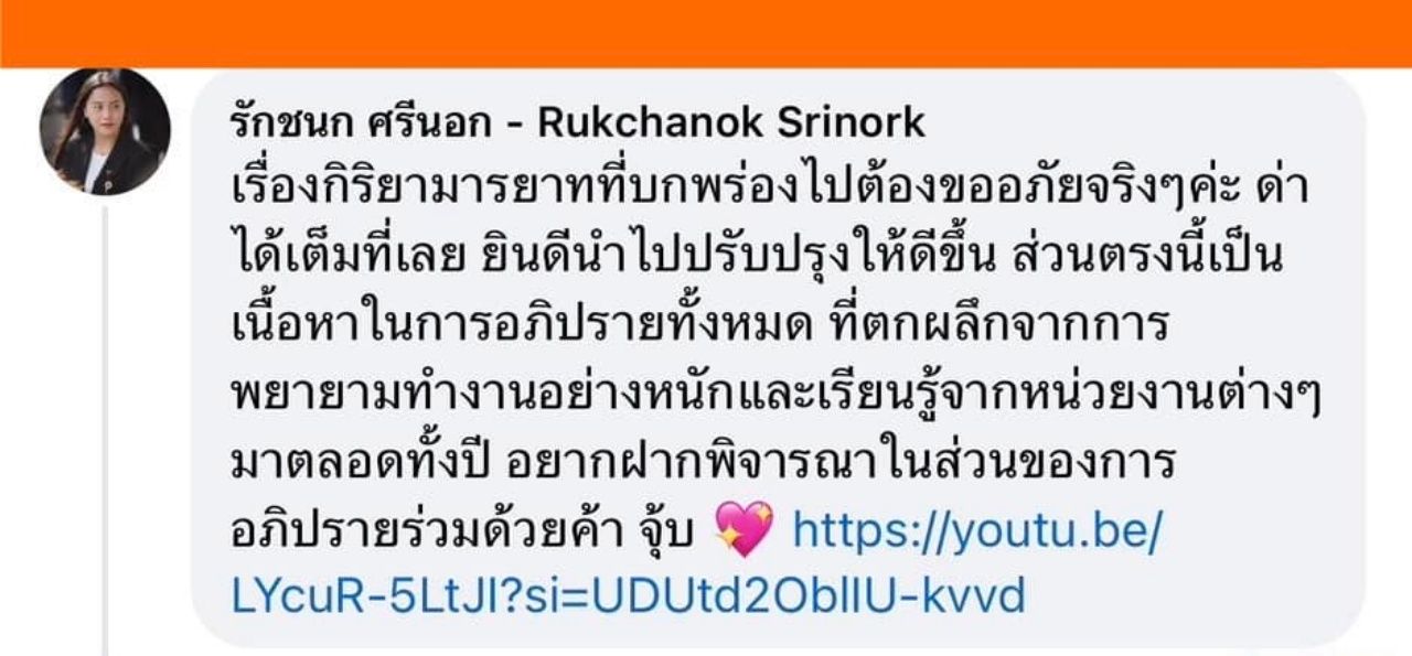 วันที่ 22 มิถุนายน 2567 น.ส.รักชนก ศรีนอก สส.กทม. พรรคก้าวไกล โพสต์ชี้แจงกรณีดราม่า กิริยาไม่เหมาะสมในการอภิปรายร่างพ.ร.บ.งบประมาณรายจ่ายประจำปี 2568 ขณะที่นายปดิพัทธ์ สันติภาดา รองประธานสภาผู้แทนราษฎรคนที่ 1 ทำหน้าที่ประธานในการประชุมกำลังวินิจฉัยเรื่องแผ่นสไลด์ของน.ส.รักชนกที่ใช้ในการอภิปราย ซึ่งน.ส.รักชนก เองได้แสดงท่าทางและสีหน้าไม่พอใจ พร้อมกอดอก ล่าสุดน.ส.รักชนก ได้ชี้แจงถึงเรื่องดังกล่าวว่า ”เรื่องกิริยามารยาทที่บกพร่องไป ต้องขออภัยจริงๆ ด่าได้เต็มที่เลย ยินดีนำไปปรับปรุงให้ดีขึ้น” พร้อมแปะลิงก์ยูทูปการอภิปรายของร่างพ.ร.บ.งบประมาณของตนเอง เมื่อคืนที่ผ่านมา ว่า ขอฝากไว้พิจารณาด้วย