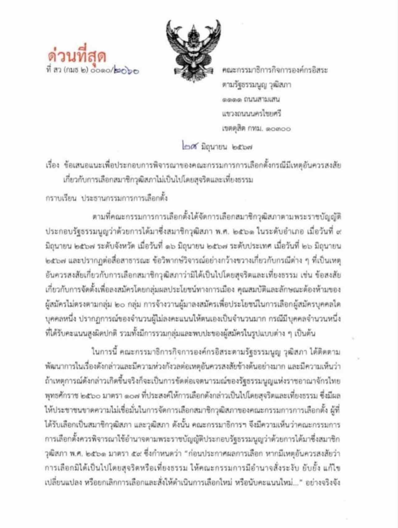 โดยหนังสือระบุว่า ตามที่ กกต.ได้จัดการเลือก สว. ตาม พ.ร.บ.ประกอบรัฐธรรมนูญว่าด้วยการได้มาซึ่ง สว. พ.ศ. 2561 ในระดับอำเภอ เมื่อวันที่ 9 มิ.ย. ระดับจังหวัด เมื่อวันที่ 16 มิ.ย. และระดับประเทศเมื่อวันที่ 26 มิ.ย. และปรากฏต่อสื่อสาธารณะข้อวิพากษ์วิจารณ์อย่างกว้างขวางเกี่ยวกับกรณีต่างๆ ที่เป็นเหตุอันควรสงสัยเกี่ยวกับการเลือกสมาชิกวุฒิสภา ว่า มิได้เป็นไปโดยสุจริตและเที่ยงธรรม เช่น ข้อสงสัยเกี่ยวกับการจัดตั้งเพื่อลงสมัครโดยกลุ่มผลประโยชน์ทางการเมือง คุณสมบัติและลักษณะต้องห้ามของผู้สมัคร ไม่ตรงตามกลุ่ม 20 กลุ่ม การจ้างวานผู้มาลงสมัครเพื่อประโยชน์ในการเลือกผู้สมัครบุคคลใดบุคคลหนึ่ง ปรากฏการณ์ของจำนวนผู้ไม่ลงคะแนนให้ตนเองเป็นจำนวนมาก กรณีมีบุคคลจำนวนหนึ่ง ที่ได้รับคะแนนสูงผิดปกติ รวมทั้งมีการรวมกลุ่มและพบปะของผู้สมัครในรูปแบบต่างๆ เป็นต้น