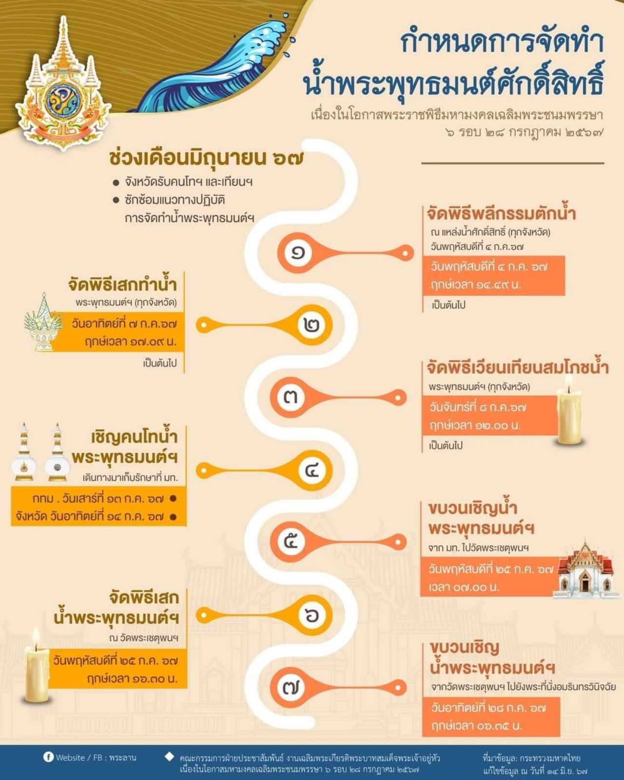 นางสาวจิราพร แจ้งว่า ในวันพรุ่งนี้ (7 กรกฎาคม 2567) เวลา 17.09 น. ทุกจังหวัดจะจัดพิธีเสกน้ำพระพุทธมนต์ศักดิ์สิทธิ์ และต่อเนื่องด้วยการจัดพิธีเวียนเทียนสมโภชน้ำพระพุทธมนต์ศักดิ์สิทธิ์ ในวันที่ 8 กรกฎาคม 2567 ตั้งแต่เวลา 12.00 น. เป็นต้นไป จากนั้นจะได้มีการจัดมหรสพสมโภช ในระหว่างวันที่ 11-15 กรกฎาคม 2567 ณ ท้องสนามหลวง ก่อนจะเชิญคนโทน้ำพุทธมนต์มาเก็บรักษาที่กระทรวงมหาดไทย เพื่อเตรียมพร้อมสำหรับพิธีเสกน้ำพระพุทธมนต์ที่วัดพระเชตุพนวิมลมังคลาราม ในวันที่ 25 กรกฎาคม 2567 จากนั้นจะได้มีการเชิญน้ำพระพุทธมนต์ฯ จากวัดพระเชตุพนฯ ไปยังพระที่นั่งอมรินทรวินิจฉัยในช่วงเช้าของวันมหามงคลเฉลิมพระชนมพรรษาเพื่อนำขึ้นทูลเกล้าฯ ถวาย ในวันเฉลิมพระชนมพรรษา 28 กรกฎาคม 2567