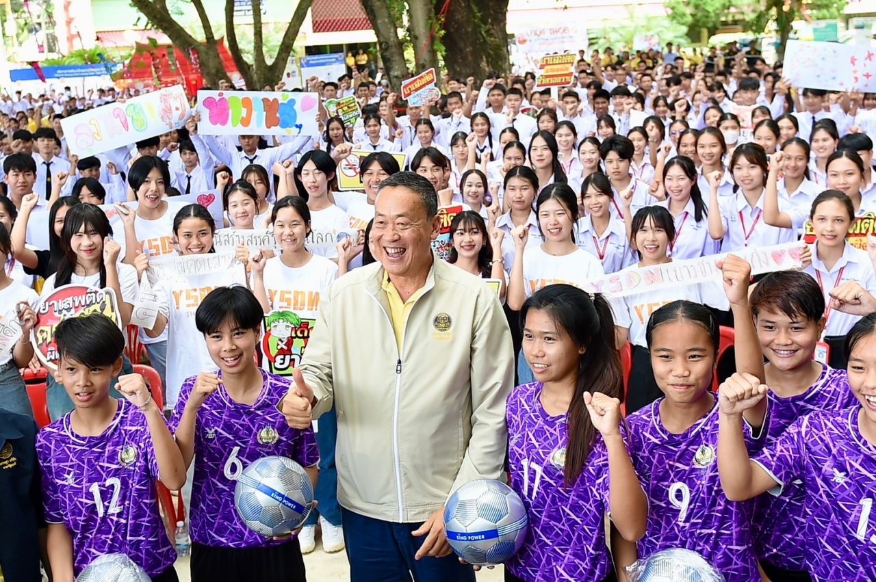 นายกรัฐมนตรี รับฟังปัญหายาเสพติดจากเยาวชน-นักเรียน รร.เทิงวิทยาคม ก่อนโดนหอมแก้มหลังรับปากหางบ 6 ล้านสร้างอาคารอเนกประสงค์เล่นกีฬาห่างไกลยาเสพติด ลั่นยอมรับไม่ได้หลังพบปัญหาพ่อแม่ให้เด็ก 6 ขวบซื้อเหล้า