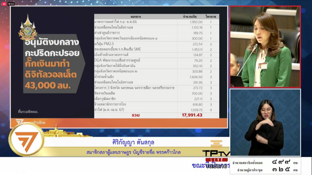 น.ส.ศิริกัญญา ตันสกุล สส.บัญชีรายชื่อ พรรคก้าวไกล กล่าวว่า การขอสภา กู้เงินเพิ่ม 1.22 แสนล้านบ้าน ส่วนการบริหารจัดการปี 67 มาจากงบกลางฉุกเฉินสำรองจำเป็น พอเห็นว่าไม่มีแหล่งเงิน จาก ธนาคารเพื่อการเกษตรและสหกรณ์การเกษตร (ธ.ก.ส.) แล้ว ก็เป็นการดี ก็ต้องให้กระทรวงการคลังไปกู้เงินแทนอยู่ดี งบประมาณ ลดลงแล้ว วงเงิน 4.5 แสนล้านบาท จาก 5 แสนล้าน ประเด็นสำคัญปีนี้ รัฐบาลขอกู้เงิน 1.22 แสนล้านบาท ก็สูงเป็นประวัติการณ์อยู่ดี สัดส่วนการกู้เงินสูงกว่า 4 เปอร์เซ็นต์ ปัญหาที่เกิดขึ้น คือ เรากู้เต็มเพดาน จะมีการกู้เพิ่ม และมีการขยายเพดานกู้ เพราะไม่เช่นนั้นจะไม่เพียงพอในการทำ โครงการดิจิทัลวอลเล็ตได้ เหมือนกับว่ารัฐบาลคิดอะไรไม่ออก ก็เบ่งงบฯ กู้เพิ่มไปเรื่อยๆ แล้วจะไม่สามารถกู้ได้อีกเลย กู้เต็มที่ไม่เกิน 8.1 แสนล้านบาท หากเกิดเหตุการณ์อะไรขึ้น ก็ไม่สามารถกู้เงินได้อีกเลย แต่รัฐบาลไม่ได้สนใจอะไร เพื่อให้ได้ทำโครงการดิจิทัลวอลเล็ตเท่านั้น