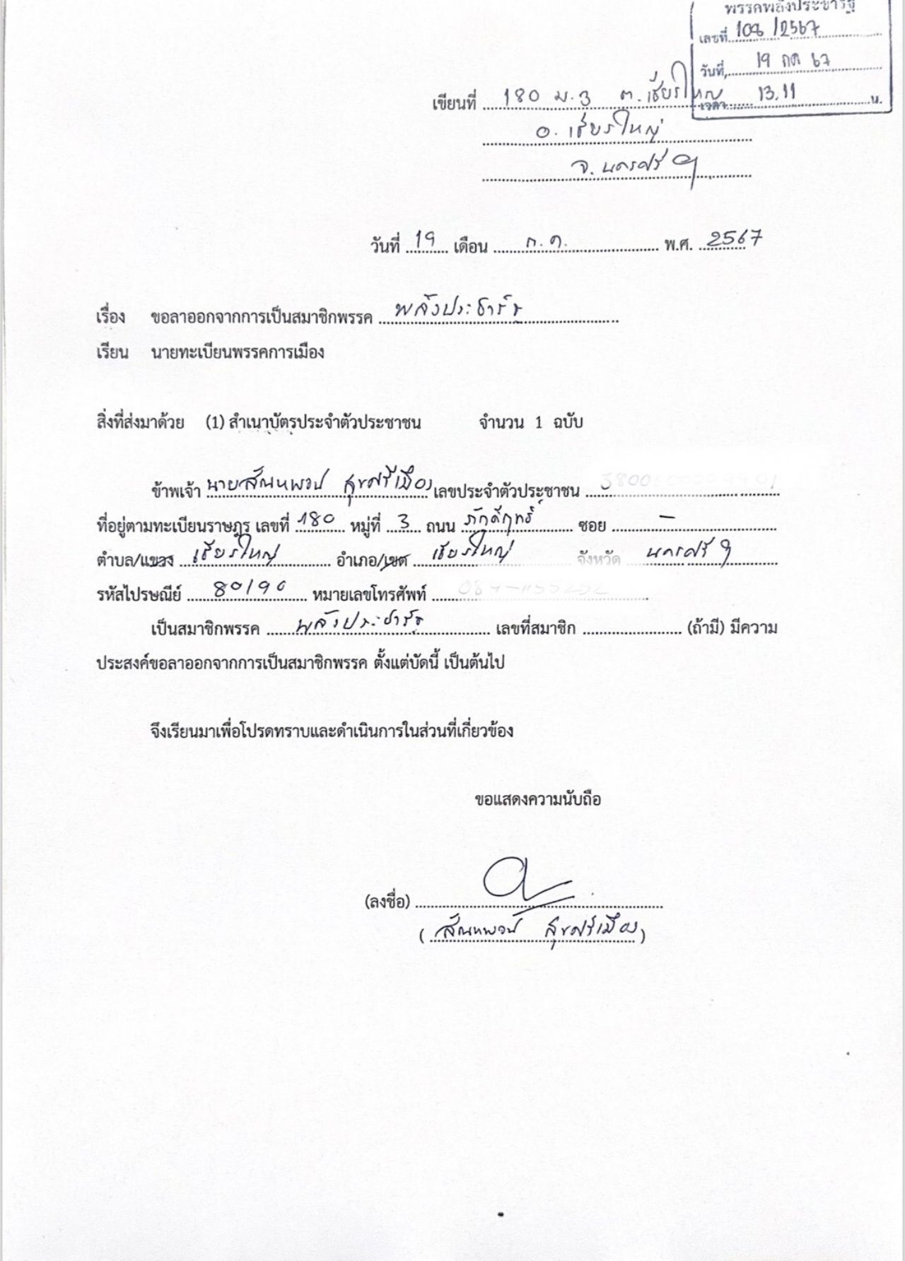 วันที่ 19 ก.ค. 2567 นายสัณหพจน์ สุขศรีเมือง รองเลขาธิการพรรคพลังประชารัฐ (พปชร.) และอดีต สส. นครศรีธรรมราช พรรคพปชร.ได้ยื่นใบลาออกจากการเป็นสมาชิกพรรคต่อนายทะเบียนพรรคการเมืองและมีผลทันที
