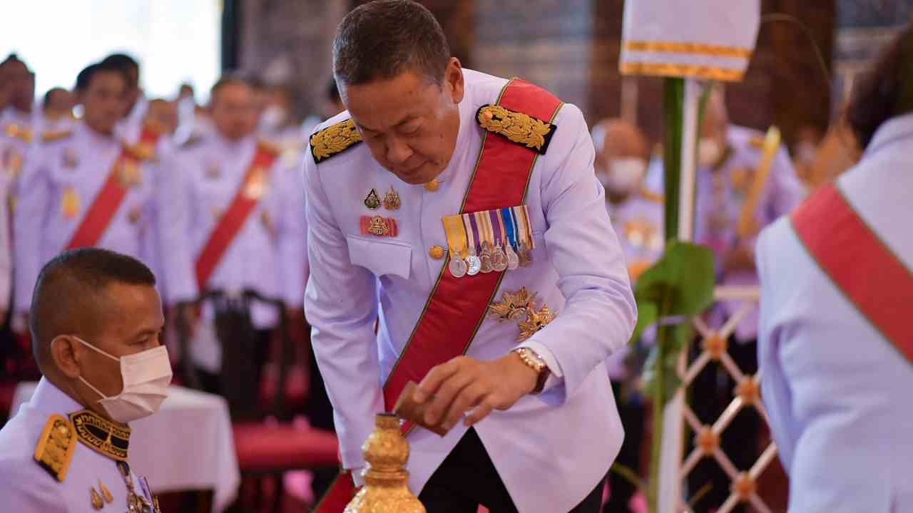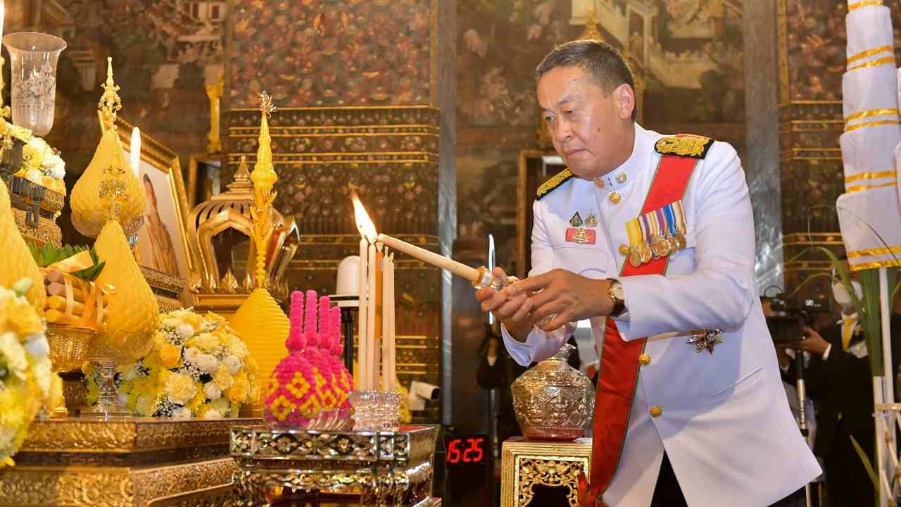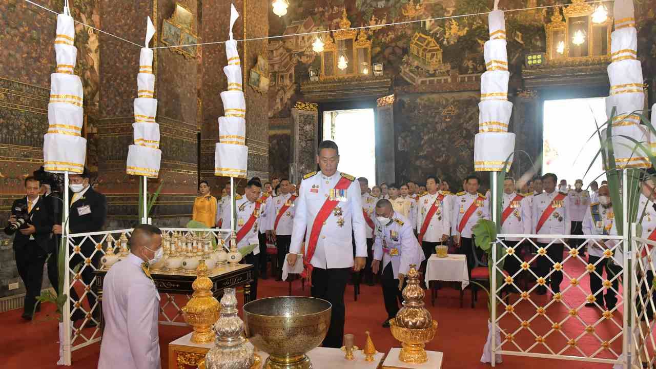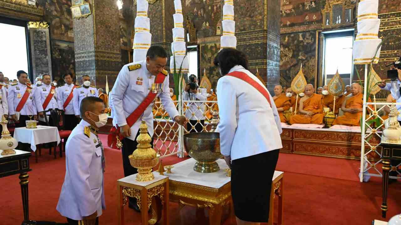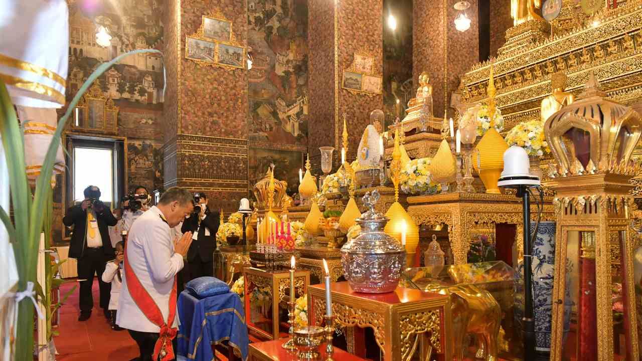 นายชัย วัชรงค์ โฆษกประจำสำนักนายกรัฐมนตรี เผยว่า เมื่อนายกรัฐมนตรีและภริยาเดินทางถึงวัดพระเชตุพนวิมลมังคลาราม ราชวรมหาวิหาร นายกรัฐมนตรี ประธานรัฐสภา และประธานศาลฎีกา เทน้ำพระพุทธมนต์ศักดิ์สิทธิ์จากคนโทน้ำพระพุทธมนต์ศักดิ์สิทธิ์ทั้ง 77 จังหวัด ลงในขันสาคร จากนั้นนายกรัฐมนตรีจุดธูปเทียนเครื่องนมัสการที่หน้าพระพุทธเทวปฏิมากรพระประธานในพระอุโบสถ ต่อจากนั้นนายกรัฐมนตรีถวายคำนับ ถวายธูปเทียนแพหน้าพระบรมฉายาลักษณ์พระบาทสมเด็จพระเจ้าอยู่หัว พระสงฆ์ให้ศีล พระมหาราชครูพิธีศรีวิสุทธิคุณ ประธานพระครูพราหมณ์ จุดธูปเทียนบูชาเทพเจ้า พระมหาราชครูพิธีศรีวิสุทธิคุณ อ่านประกาศ เจ้าหน้าที่อาราธนาพระปริตร พระสงฆ์ 73 รูป เจริญพระพุทธมนต์