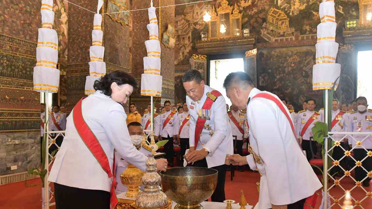 โดยในเวลา 15.09 น. สมเด็จพระธีรญาณมุนี เจ้าอาวาสวัดเทพศิรินทราวาส ราชวรวิหาร ที่ปรึกษาเจ้าคณะภาค 1-2-3 และภาค 12-13 (ธรรมยุต) กรรมการมหาเถรสมาคม เป็นประธานสงฆ์ นายเศรษฐา ทวีสิน นายกรัฐมนตรี นายพิเชษฐ์ เชื้อเมืองพาน รองประธานสภาผู้แทนราษฎร คนที่ 2 ผู้แทนประธานรัฐสภา และนางอโนชา ชีวิตโสภณ ประธานศาลฎีกา ร่วมกันเทน้ำพระพุทธมนต์ศักดิ์สิทธิ์จากคนโทน้ำพระพุทธมนต์ศักดิ์สิทธิ์ทั้ง 77 จังหวัด ทั่วราชอาณาจักร ลงในขันสาคร