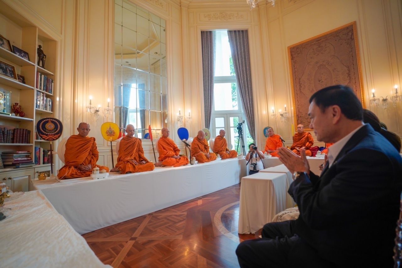 ส่วน นายทักษิณ ได้นิมนต์พระมาเลี้ยงเพลที่บ้านจันทร์ส่องหล้า 9 รูป ในเวลา 10.00 น. อาทิ สมเด็จพระมหารัชมงคลมุนี (สมเด็จธงชัย) วัดไตรมิตรวิทยาราม และพระสมเด็จจากวัดพระเชตุพนวิมลมังคลารามราชวรมหาวิหาร วัดสระเกศราชวรมหาวิหาร วัดมหาธาตุยุวราชรังสฤษฎิ์ราชวรมหาวิหาร วัดพระราม 9 กาญจนาภิเษก และพระสมเด็จ จังหวัดเชียงใหม่ มาร่วมทำบุญในวันคล้ายวันเกิดด้วย โดยถือเป็นงานทำบุญวันเกิดครั้งแรกที่บ้านจันทร์ส่องหล้า หลังจาก นายทักษิณ ไม่ได้กลับประเทศไทยนานถึง 17 ปี.