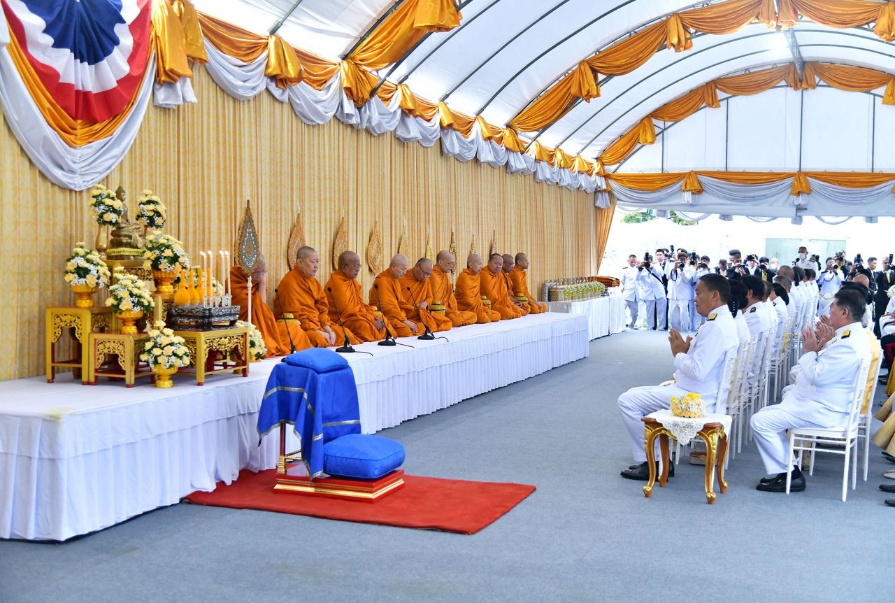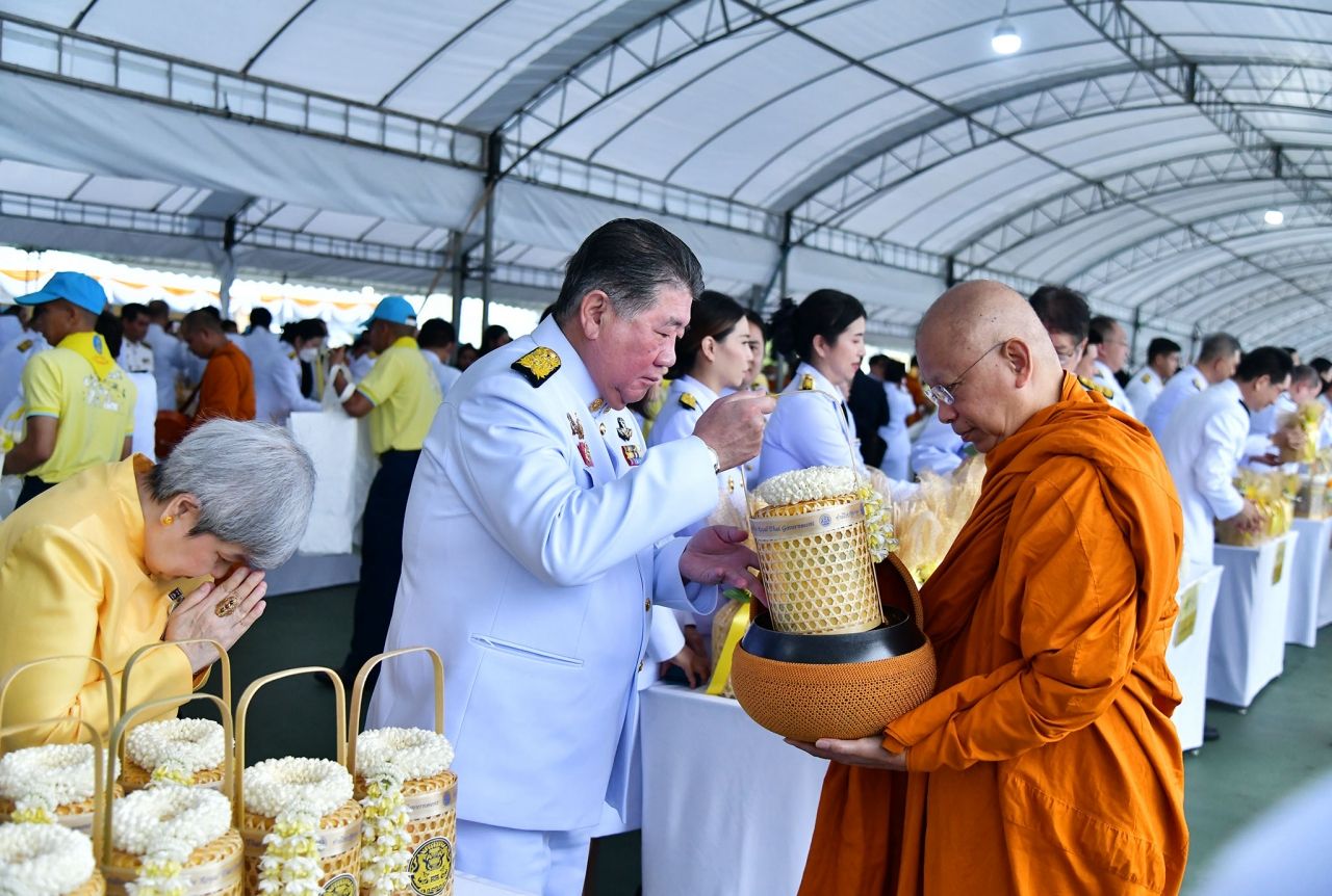 โดยเมื่อนายกรัฐมนตรีและภริยา เดินทางถึงปะรำพิธีท้องสนามหลวง สมเด็จพระราชาคณะ พระราชาคณะ จำนวน 10 รูป ขึ้นนั่งอาสน์สงฆ์ นายกรัฐมนตรีจุดธูปเทียนบูชาพระรัตนตรัย ถวายคำนับและถวายธูปเทียนแพหน้าพระบรมฉายาลักษณ์พระบาทสมเด็จพระเจ้าอยู่หัว เจ้าหน้าที่อาราธนาศีล สมเด็จพระราชาคณะ พระราชาคณะ ให้ศีล พระสงฆ์เจริญพระพุทธมนต์ จากนั้น คณะองคมนตรีและภริยา นายกรัฐมนตรีและภริยา ประธานรัฐสภา ประธานศาลฎีกา ประธานองค์กรตามรัฐธรรมนูญ ถวายเครื่องไทยธรรมแด่พระสงฆ์ จำนวน 10 รูป นายกรัฐมนตรีถวายผ้าไตรจำนวน 10 ไตร กรวดน้ำรับพร แล้วจึงนำผู้เข้าร่วมพิธีร่วมตักบาตรพระสงฆ์จำนวน 173 รูป