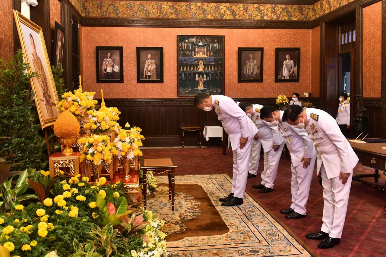 นายกรัฐมนตรีและภริยา รองนายกรัฐมนตรีและภริยา ถวายความเคารพพระบรมฉายาลักษณ์พระบาทสมเด็จพระเจ้าอยู่หัว จากนั้น นายกรัฐมนตรีถวายแจกันดอกไม้ จำนวน 2 แจกัน ในนาม 1. นายกรัฐมนตรีและคณะรัฐมนตรี 2. นายกรัฐมนตรีและภริยา ณ โต๊ะด้านหน้าพระบรมฉายาลักษณ์ฯ จากนั้น นายกรัฐมนตรีและภริยาลงนามถวายพระพร นายกรัฐมนตรีและภริยา รองนายกรัฐมนตรีและภริยา ถวายความเคารพพระบรมฉายาลักษณ์ฯ เสร็จพิธี.