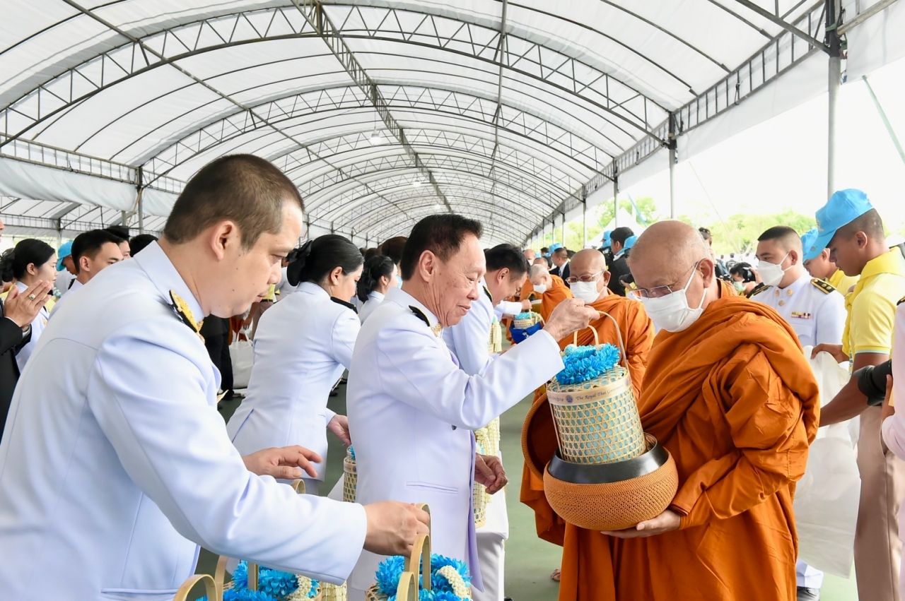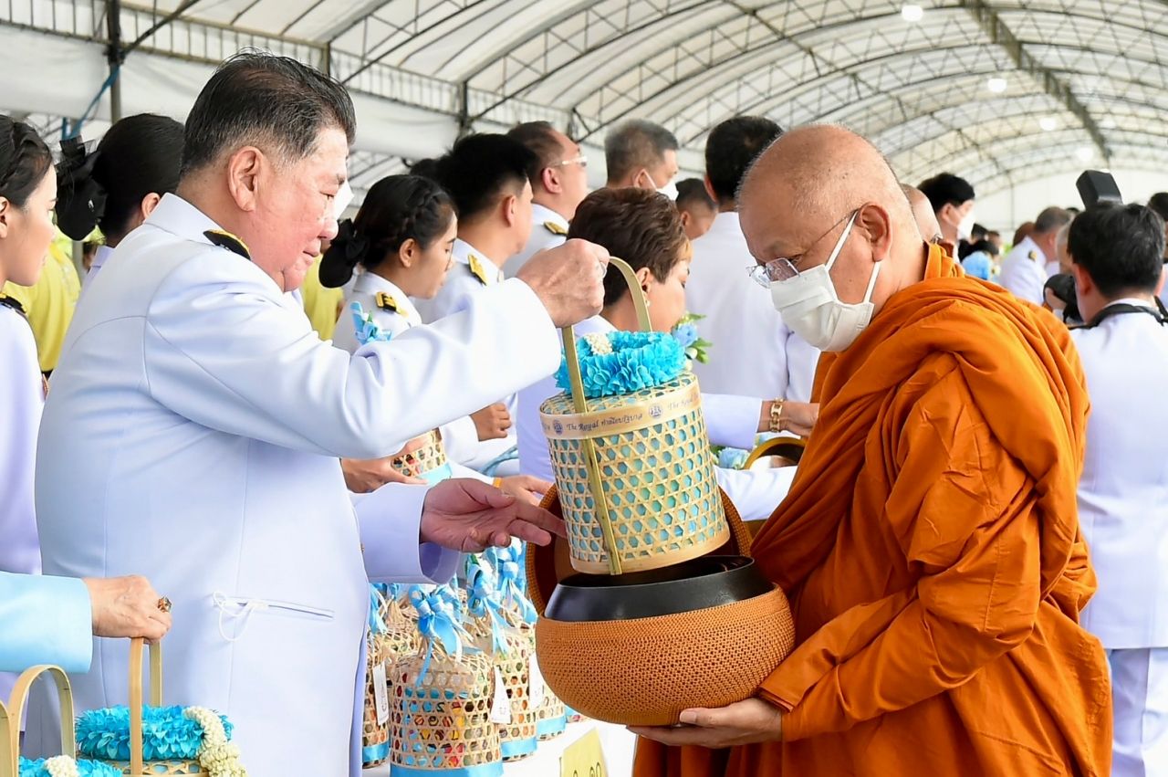 จากนั้นประธานองคมนตรีและภริยา คณะองคมนตรีและภริยา นายกรัฐมนตรี ประธานรัฐสภา ประธานศาลฎีกา ประธานองค์กรตามรัฐธรรมนูญ ถวายเครื่องไทยธรรมแด่พระสงฆ์ 10 รูป นายกรัฐมนตรีถวายผ้าไตรจำนวน 10 ไตร กรวดน้ำรับพร กราบลาพระรัตนตรัย แล้วถวายความเคารพหน้าพระฉายาลักษณ์สมเด็จพระนางเจ้าสิริกิติ์ พระบรมราชินีนาถ พระบรมราชชนนีพันปีหลวง ก่อนที่นายกรัฐมนตรีจะนำผู้เข้าร่วมพิธีร่วมตักบาตรพระสงฆ์ จำนวน 193 รูป