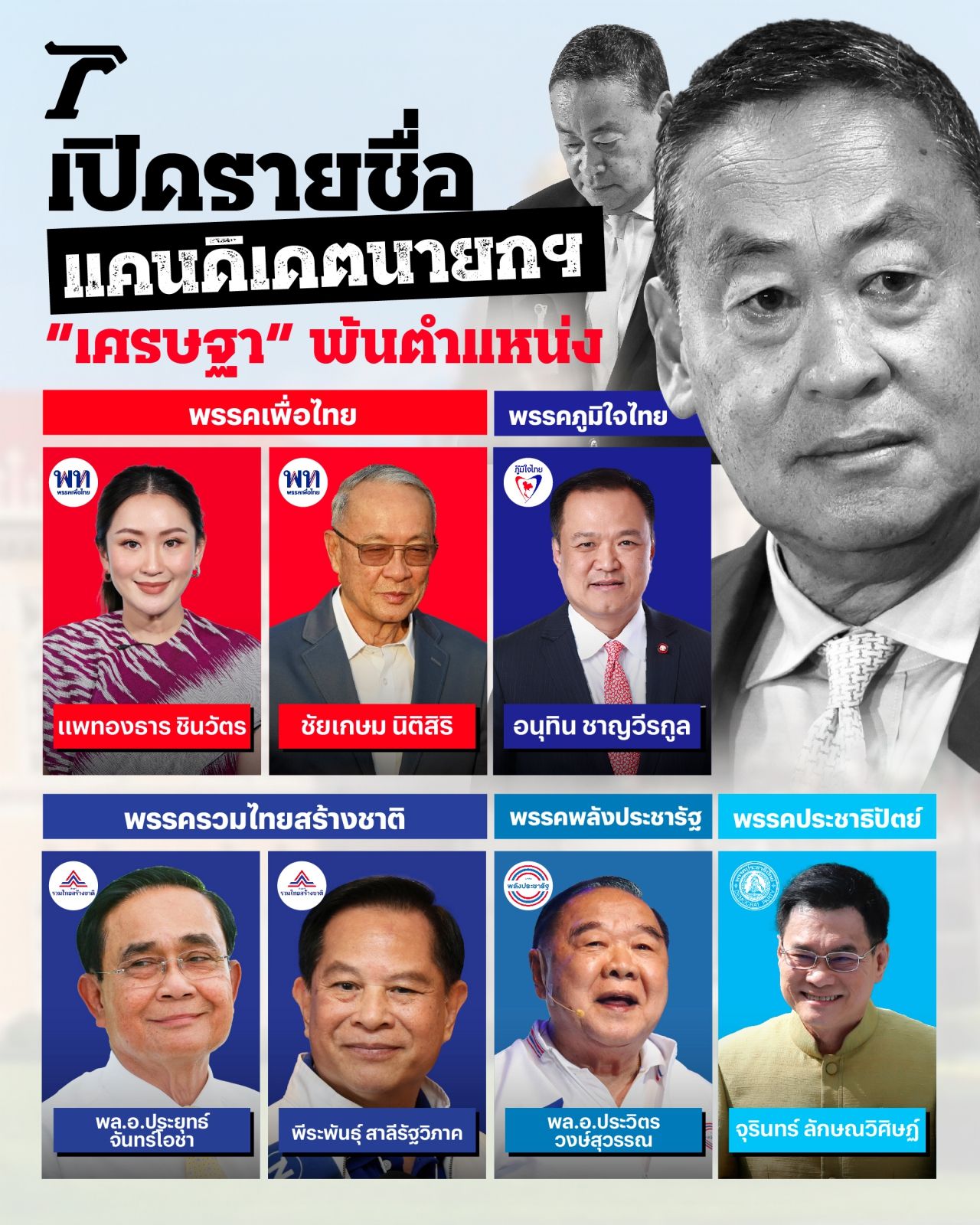 ทั้งนี้ ยังมีแคนดิเดตนายกรัฐมนตรีที่เหลืออยู่ 7 คน จาก 5 พรรคการเมือง คือ พรรคเพื่อไทย น.ส.แพทองธาร ชินวัตร หัวหน้าพรรค และนายชัยเกษม นิติสิริ, นายอนุทิน ชาญวีรกูล หัวหน้าพรรคภูมิใจไทย, พล.อ.ประวิตร วงษ์สุวรรณ หัวหน้าพรรคพลังประชารัฐ, พรรครวมไทยสร้างชาติ คือ พล.อ.ประยุทธ์ จันทร์โอชา (ปัจจุบันเป็นองคมนตรี) นายพีระพันธุ์ สาลีรัฐวิภาค หัวหน้าพรรค และนายจุรินทร์ ลักษณวิศิษฏ์ สส.บัญชีรายชื่อ พรรคประชาธิปัตย์