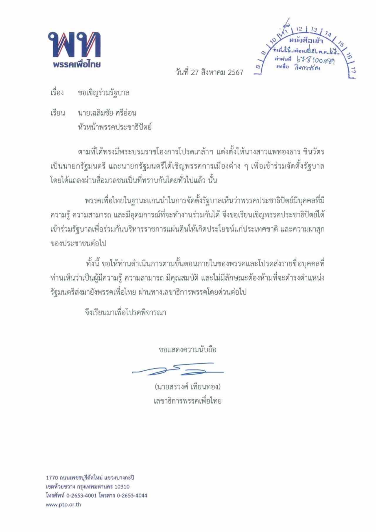 ปชป.เรียกประชุมพรรค ด่วน! พรุ่งนี้ 5 โมงเย็น พิจารณา วาระเข้าร่วมรัฐบาลเพื่อไทย และเสนอชื่อบุคคลไปดำรงตำแหน่งทางการเมือง ภายหลังพรรคเพื่อไทย ส่งหนังสือเชิญปชป.เข้าร่วมเป็นทางการ