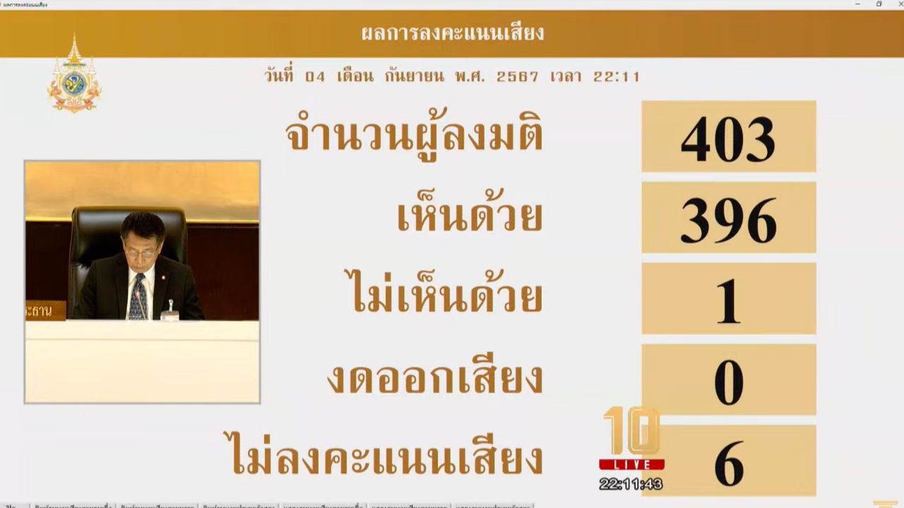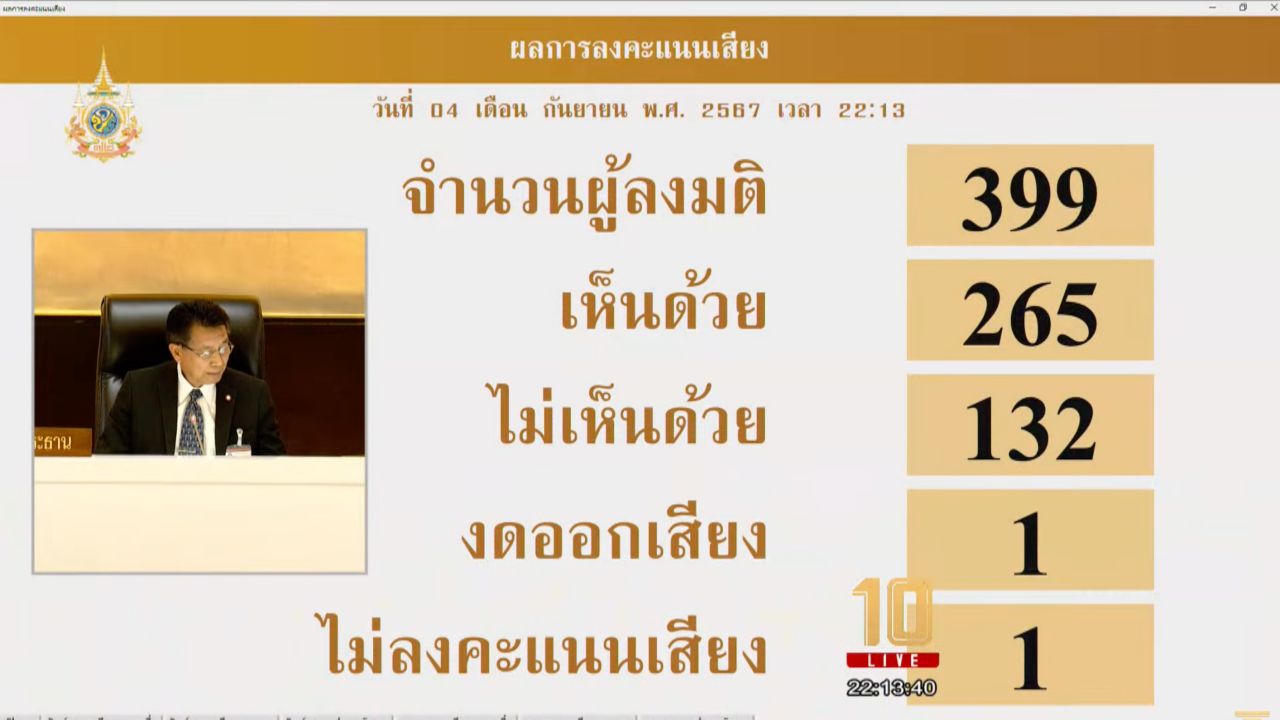 จากนั้นเวลา 22.06 น. เข้าสู่การลงมติ โดยที่ประชุมมีมติเห็นชอบกับการแก้ไข ด้วยคะแนน 396 เสียง ไม่เห็นด้วย 1 เสียง ขณะเดียวกัน ที่ประชุมยังเห็นชอบกับการแก้ไขของกรรมาธิการเสียงข้างมาก ด้วยคะแนน 265 ต่อ 132 เสียง โดยภายหลังลงมติในมาตรา 24 เสร็จสิ้น นายพิเชษฐ์ เชื้อเมืองพาน รองประธานสภาผู้แทนราษฎร คนที่ 2 ทำหน้าที่ประธานการประชุม สั่งพักการประชุมวันที่ 2 ไปเมื่อเวลา 22.14 น. โดยวันที่ 5 กันยายน 2567 จะประชุมต่อในมาตรา 25 งบประมาณรายจ่ายของกระทรวงสาธารณสุขและหน่วยงานในกำกับ ซึ่งเป็นวันสุดท้าย และหลังจากพิจารณาในวาระ 2 เสร็จ จะเข้าสู่วาระ 3 เพื่อลงมติ.