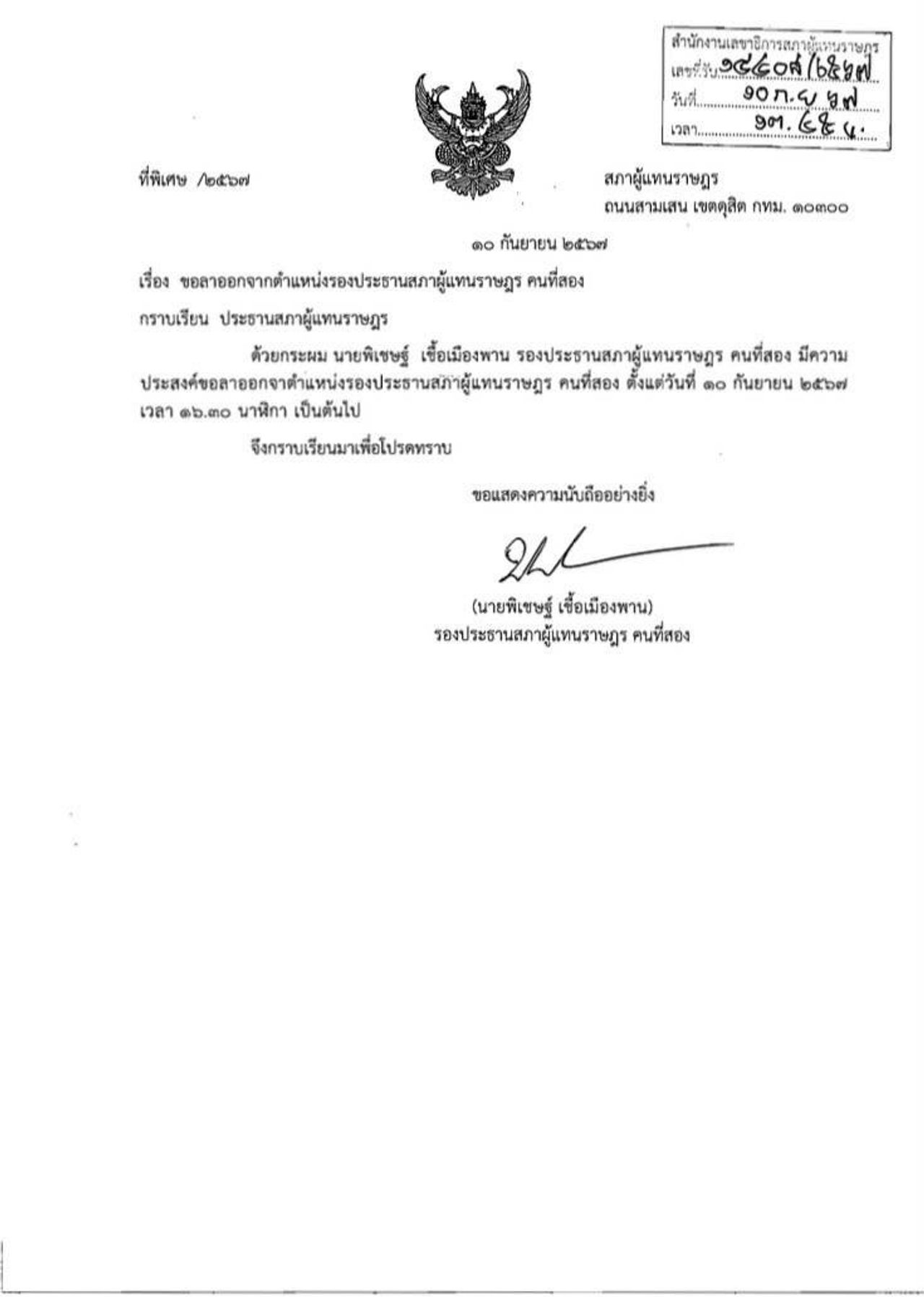 วันที่ 10 กันยายน 2567 ผู้สื่อข่าวรายงานจากรัฐสภาว่า นายพิเชษฐ์ เชื้อเมืองพาน รองประธานสภาผู้แทนราษฎรคนที่ 2 ได้ยื่นหนังสือถึงประธานสภาผู้แทนราษฎร ขอลาออกจากตำแหน่งรองประธานสภาฯ คนที่ 2 แล้ว โดยเนื้อความในหนังสือระบุว่า “ด้วยกระผม นายพิเชษฐ์ เชื้อเมืองพาน รองประธานสภาผู้แทนราษฎร คนที่สอง มีความประสงค์ขอลาออกจากตำแหน่งรองประธานสภาผู้แทนราษฎร คนที่สอง ตั้งแต่วันที่ 10 กันยายน 2567 เวลา 16.30 น. เป็นต้นไป”