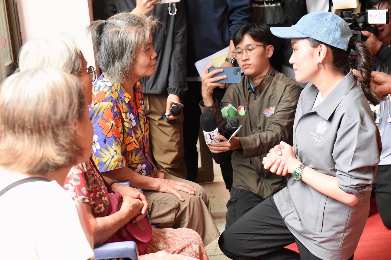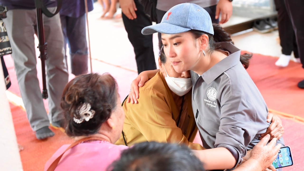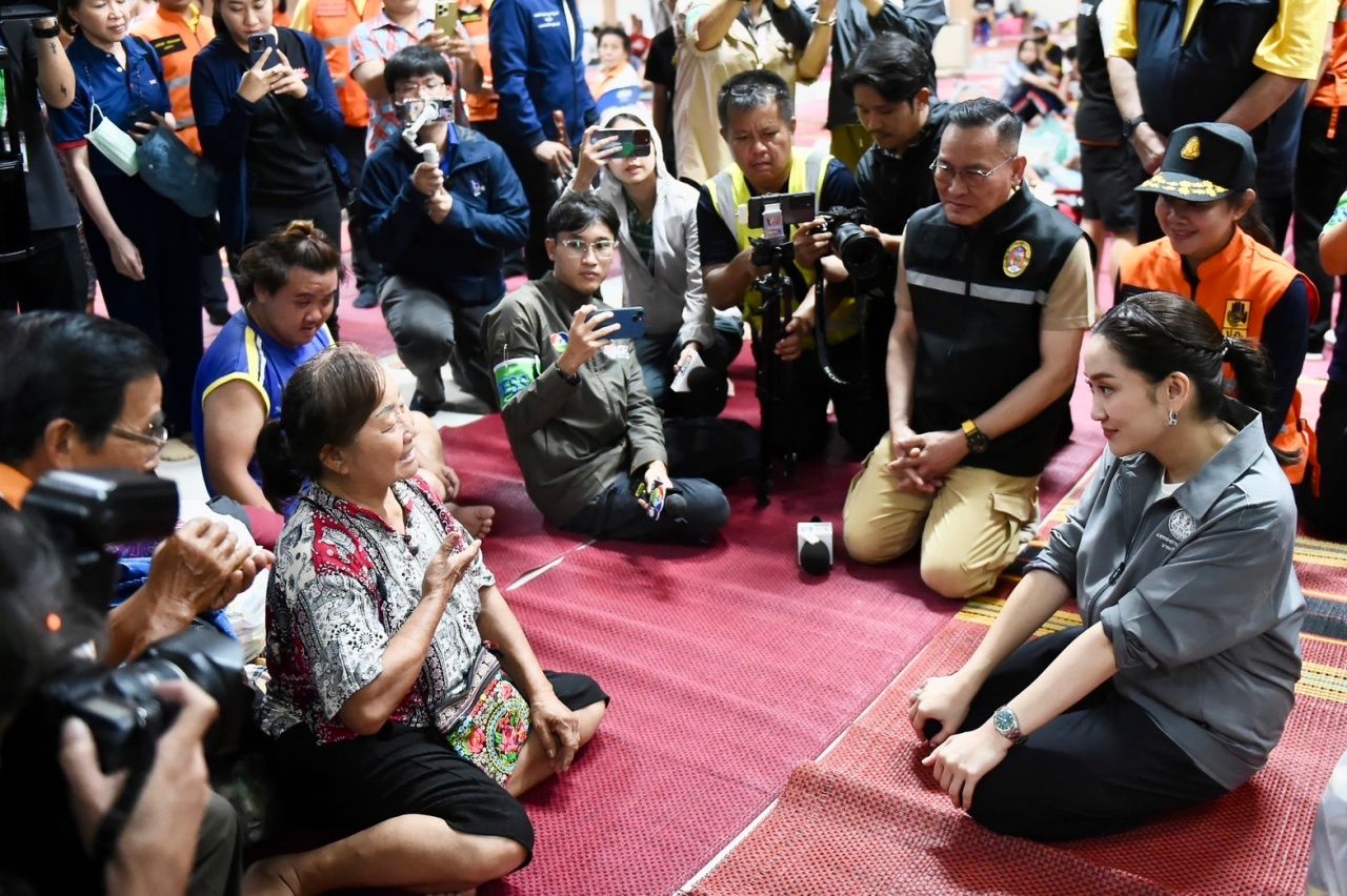 ต่อมา เวลา 12.30 น. น.ส.แพทองธาร และคณะเดินทางมายังวัดพรหมวิหาร อ.แม่สาย ซึ่งเปิดเป็นศูนย์พักพิงสำหรับผู้ประสบภัย เพื่อเยี่ยมและให้กำลังใจผู้ประสบภัย เมื่อมาถึงนายกฯ ได้เข้าไปนั่งพูดคุยและสวมกอดชาวบ้าน ทำให้ชาวบ้านเข้ามาสวมกอดและร่ำไห้ โดยประชาชนในศูนย์พักพิงต่างเข้ามาหานายกฯ และสะท้อนความรู้สึก อาทิ ลำบากมากยังมีบางคนที่ไม่ยอมออกจากบ้าน โดยเฉพาะคนแก่จึงอยากให้รัฐบาลประกาศย้ำหากมีพายุเกิดขึ้น ให้ออกมาขอให้ชาวบ้านที่ไม่ยอมออกจากบ้านเพื่อรักษาชีวิต บางคนบอกว่า ไม่เหลืออะไรแล้ว หมดตัว ร้องไห้จนไม่รู้จะร้องอย่างไรแล้ว