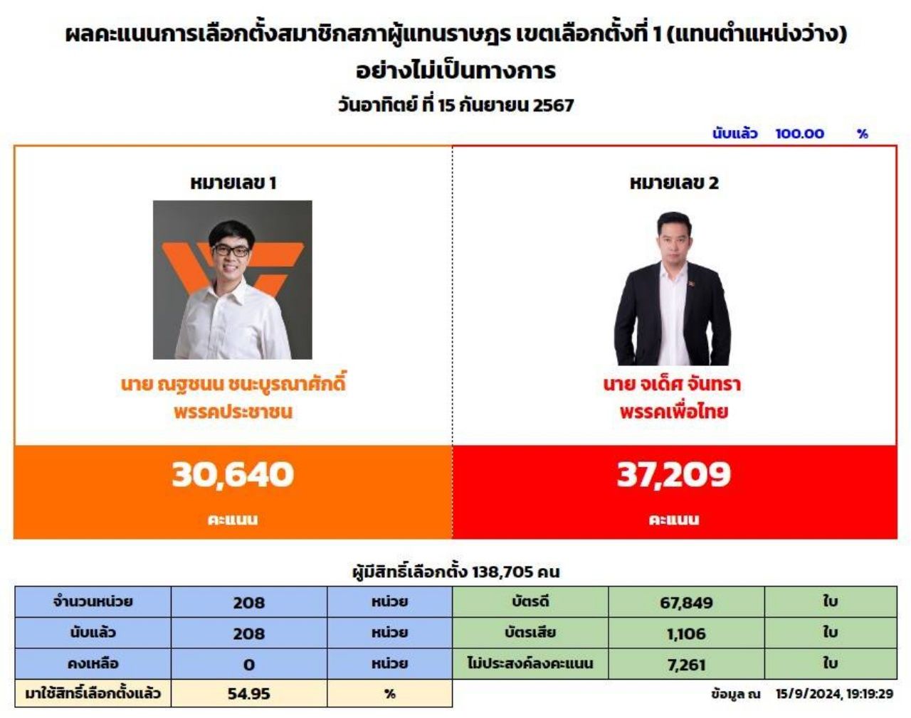 เลือกตั้งซ่อม สส. เขต 1 พิษณุโลก นับคะแนน 100% ผลไม่เป็นทางการ "จเด็ศ" จากเพื่อไทย มีคะแนนห่างจาก "ณฐชนน" จากพรรคประชาชน อยู่กว่า 6 พันคะแนน