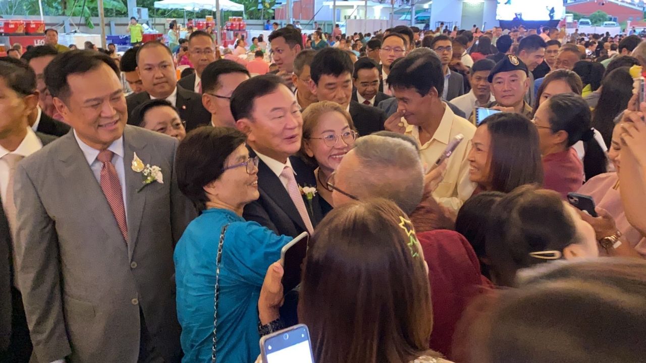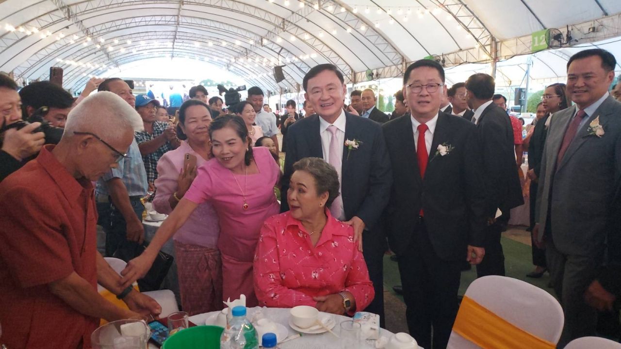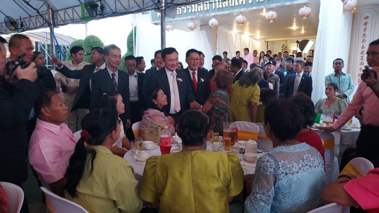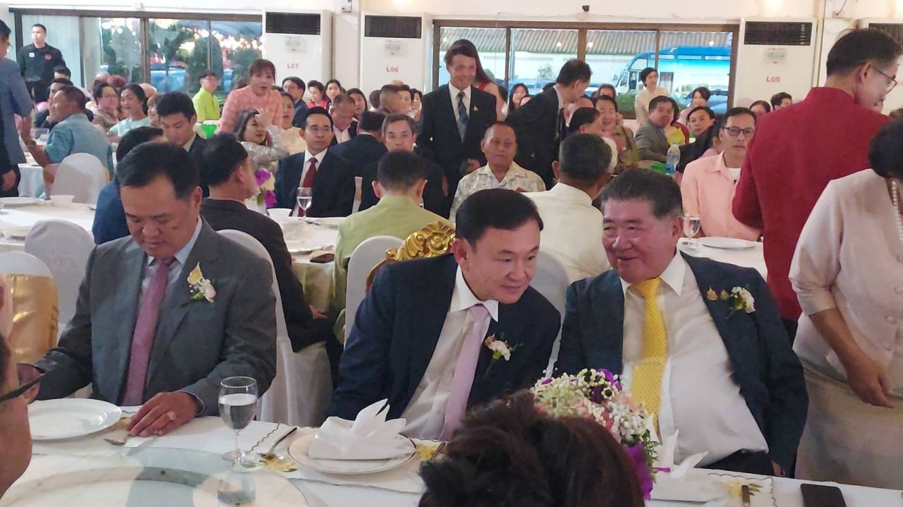 โดยหลังจากถ่ายรูปร่วมกับคู่บ่าวสาว นายทักษิณ ได้เดินทักทายผู้ที่มาร่วมงาน ซึ่งต่างโผเข้ากอดนายทักษิณด้วยความคิดถึง และขอถ่ายภาพร่วมกัน บรรยากาศเป็นไปอย่างคึกคัก โดยมีตำรวจทั้งในและนอกเครื่องแบบคอยอารักขาความปลอดภัยอย่างใกล้ชิด