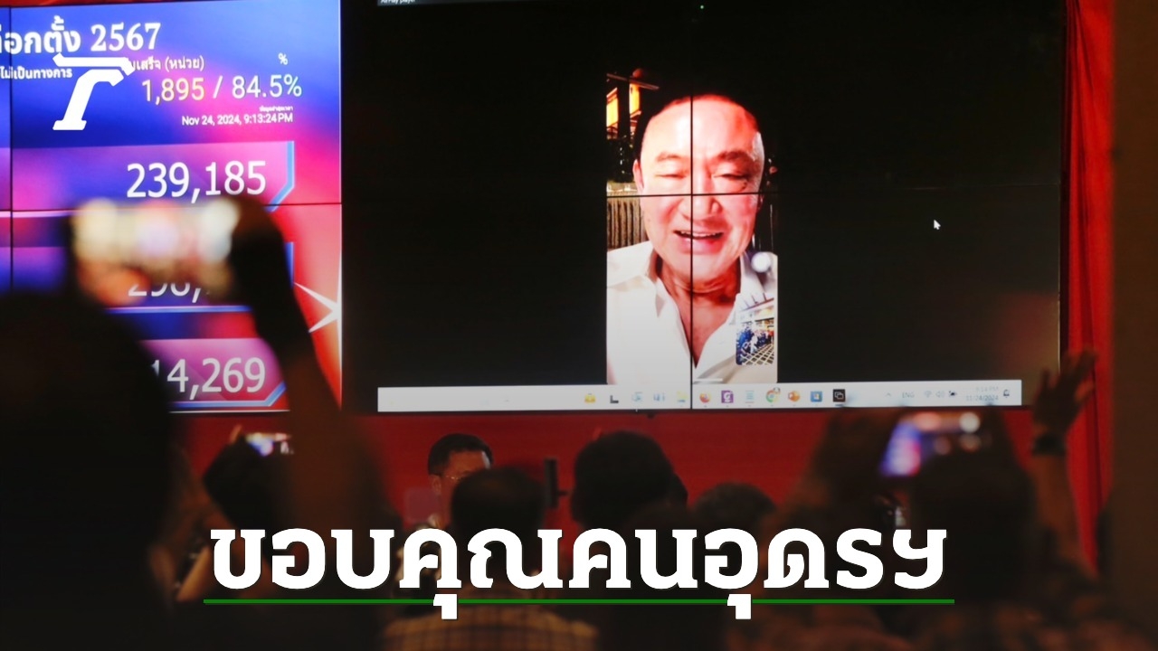 วันที่ 24 พ.ย. 2567 เมื่อเวลา 21.12 น. ที่ศูนย์การเลือกตั้ง พรรคเพื่อไทย จ.อุดรธานี นายทักษิณ ชินวัตร อดีตนายกรัฐมนตรี ในฐานะผู้ช่วยหาเสียง ได้วิดีโอคอลเข้ามาแสดงความยินดีกับนายศราวุธ เพชรพนมพร ผู้สมัครลงรับเลือกตั้งนายกองค์การบริหารส่วนจังหวัดอุดรธานี หมายเลข 2 พรรคเพื่อไทย หลังทราบผลอย่างไม่เป็นทางการว่าชนะเลือกตั้งแล้ว
