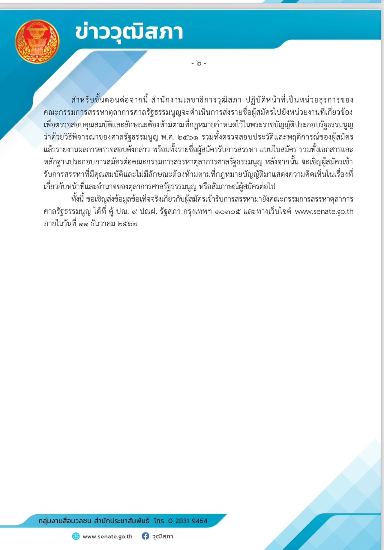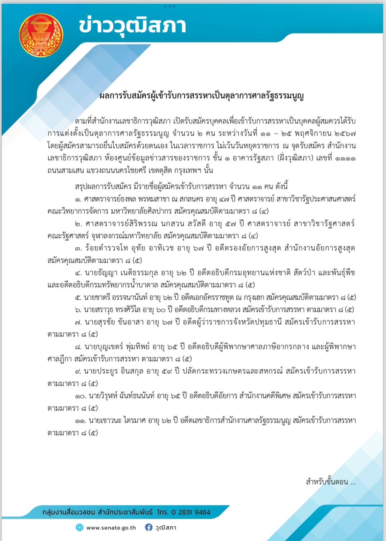 วันที่ 26 พฤศจิกายน 2567 จากกรณีที่สำนักงานเลขาธิการวุฒิสภา เปิดรับสมัครบุคคลเพื่อเข้ารับการสรรหาเป็นบุคคลผู้สมควรได้รับการแต่งตั้งเป็นตุลาการศาลรัฐธรรมนูญ จำนวน 2 คน ระหว่างวันที่ 11-25 พฤศจิกายน 2567 โดยผู้สมัครสามารถยื่นใบสมัครด้วยตนเอง ในเวลาราชการ ไม่เว้นวันหยุดราชการ ณ จุดรับสมัคร สำนักงานเลขาธิการวุฒิสภานั้น สรุปผลการรับสมัคร มีรายชื่อผู้สมัครเข้ารับการสรรหา จำนวน 11 คน ดังนี้