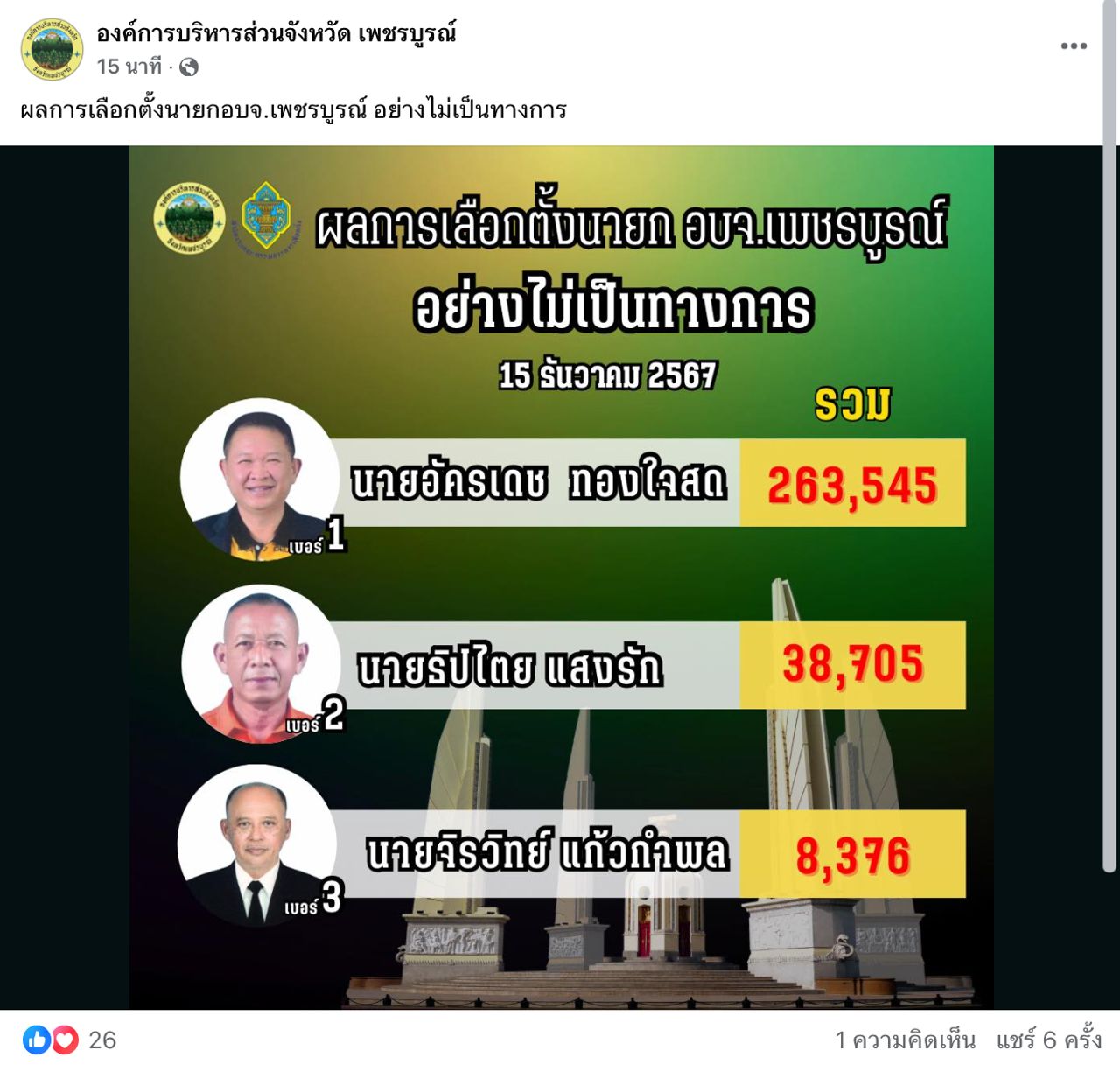 เมื่อเวลา 21.24 น. วันที่ 15 ธันวาคม 2567 องค์การบริหารส่วนจังหวัดเพชรบูรณ์ เปิดเผยผลคะแนนเลือกตั้งนายกองค์การบริหารส่วนจังหวัดเพชรบูรณ์ อย่างไม่เป็นทางการ ผ่านทางเฟซบุ๊ก ภายหลังปิดหีบตั้งแต่เวลา 17.00 น. ที่ผ่านมา มีผลคะแนนเป็นดังนี้