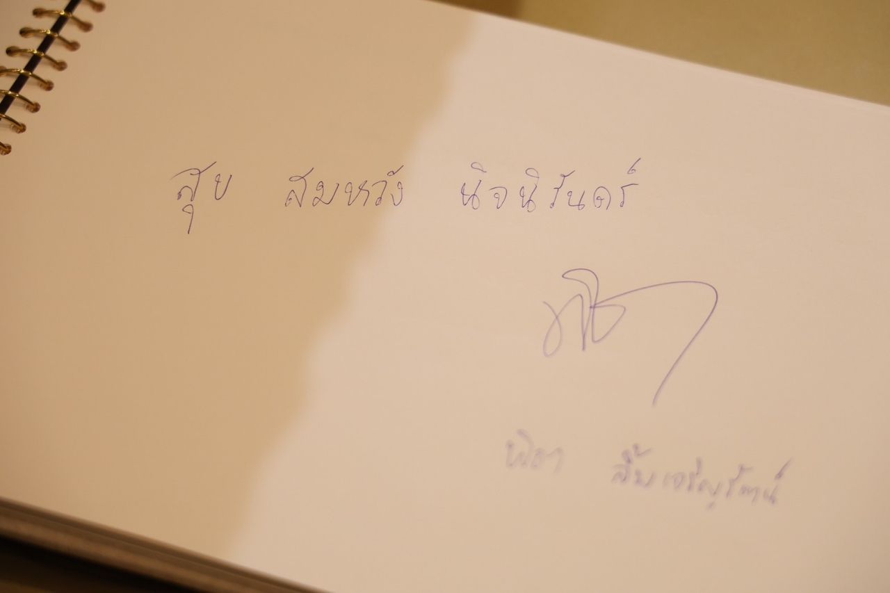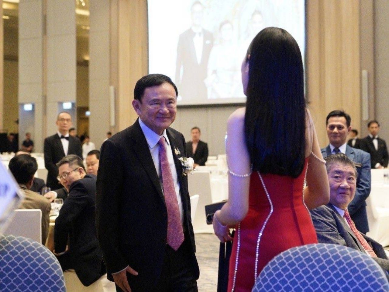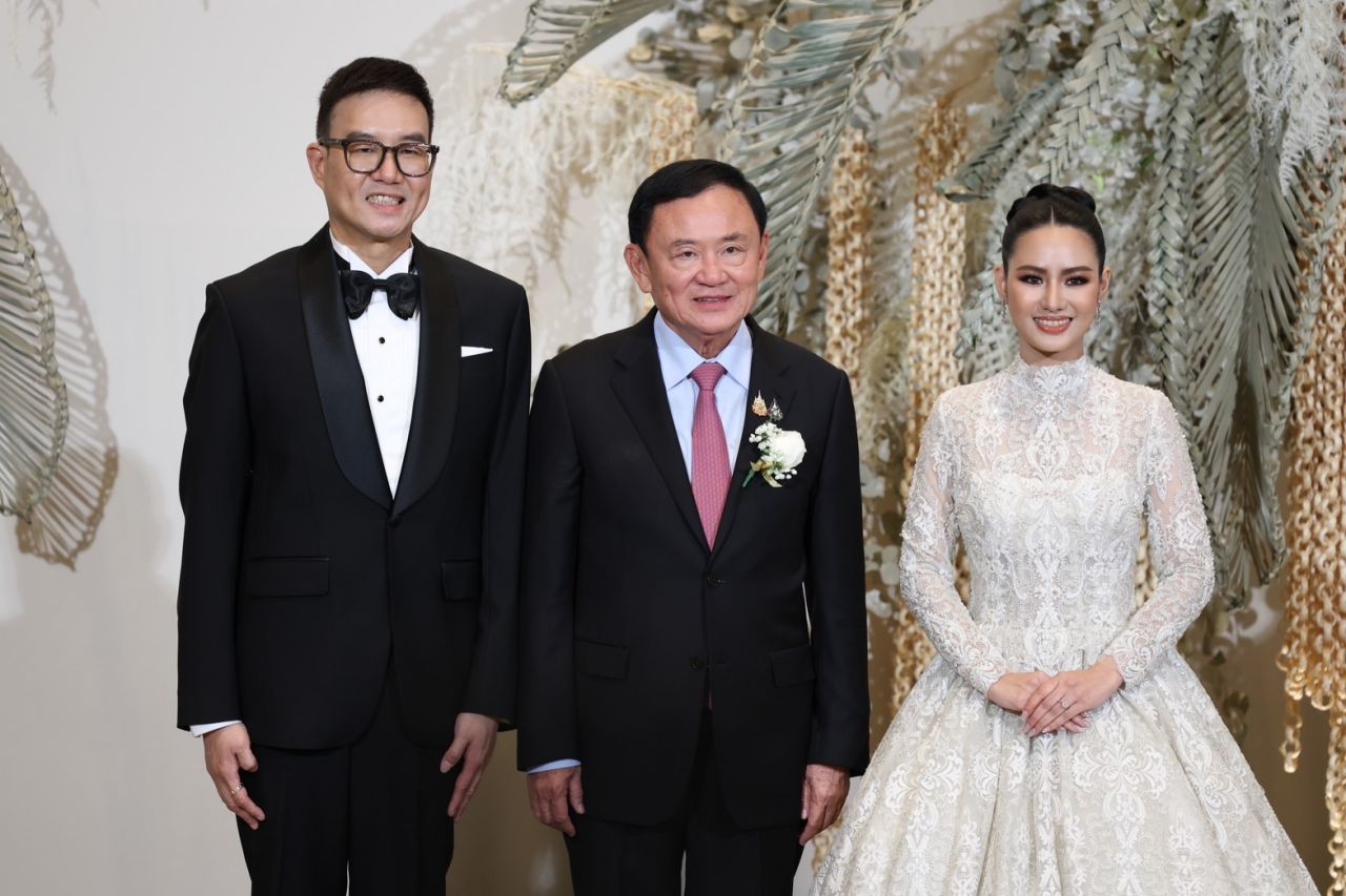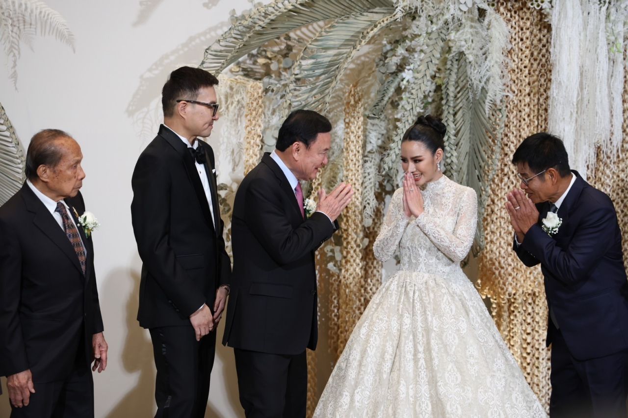 โดยนายทักษิณ เดินทางมาถึงเวลา 18.15 น. พร้อมกับนายภูมิธรรม เวชยชัย รองนายกรัฐมนตรี และรัฐมนตรีว่าการกระทรวงกลาโหม และ นายชูศักดิ์ ศิรินิล รัฐมนตรีประจำสำนักนายกรัฐมนตรี และ ส.ส.พรรคเพื่อไทย ซึ่งเจ้าบ่าว เจ้าสาว และครอบครัวให้การต้อนรับอย่างอบอุ่น นายทักษิณได้เขียนคำอวยพรลงในสมุดว่า “ขอแสดงความยินดีกับทั้ง 2 คน ได้ร่วมชีวิตกัน อวยพรให้มีความสุข สมหวัง สำเร็จในชีวิตคู่ตลอดไป” หลังจากนั้นได้ร่วมบันทึกภาพกับเจ้าบ่าวและเจ้าสาว เสร็จแล้วเดินเข้าห้องจัดเลี้ยงมงคลสมรส