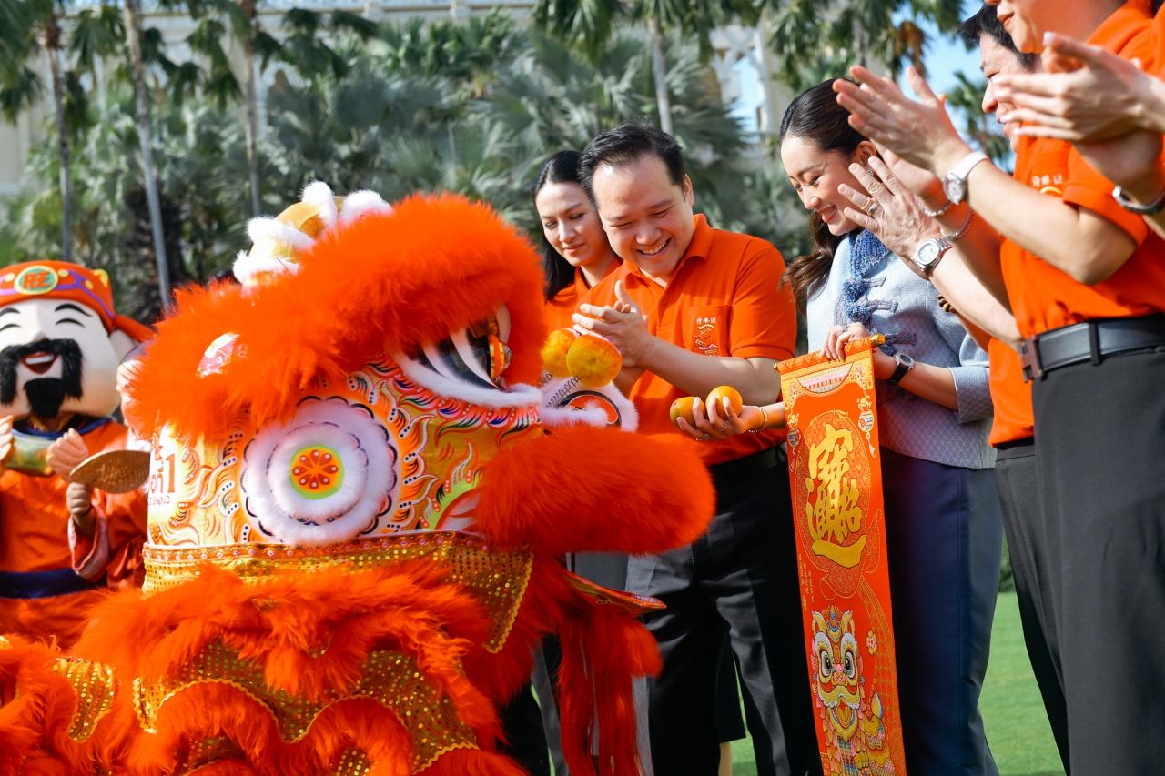 ระหว่างการแสดงสิงโตได้โปรยผักกาดหอม พร้อมมอบส้ม เสื้อภูฟ้าสีแดงลายปีมะเส็ง และป้ายคำอวยพร ให้กับนายกรัฐมนตรี โดยนายกรัฐมนตรีได้ยกแขนน้อมรับ ก่อนนำมือลูบศีรษะ พร้อมมอบอั่งเปาให้สิงโตเช่นกัน ซึ่งเป็นไปตามประเพณี